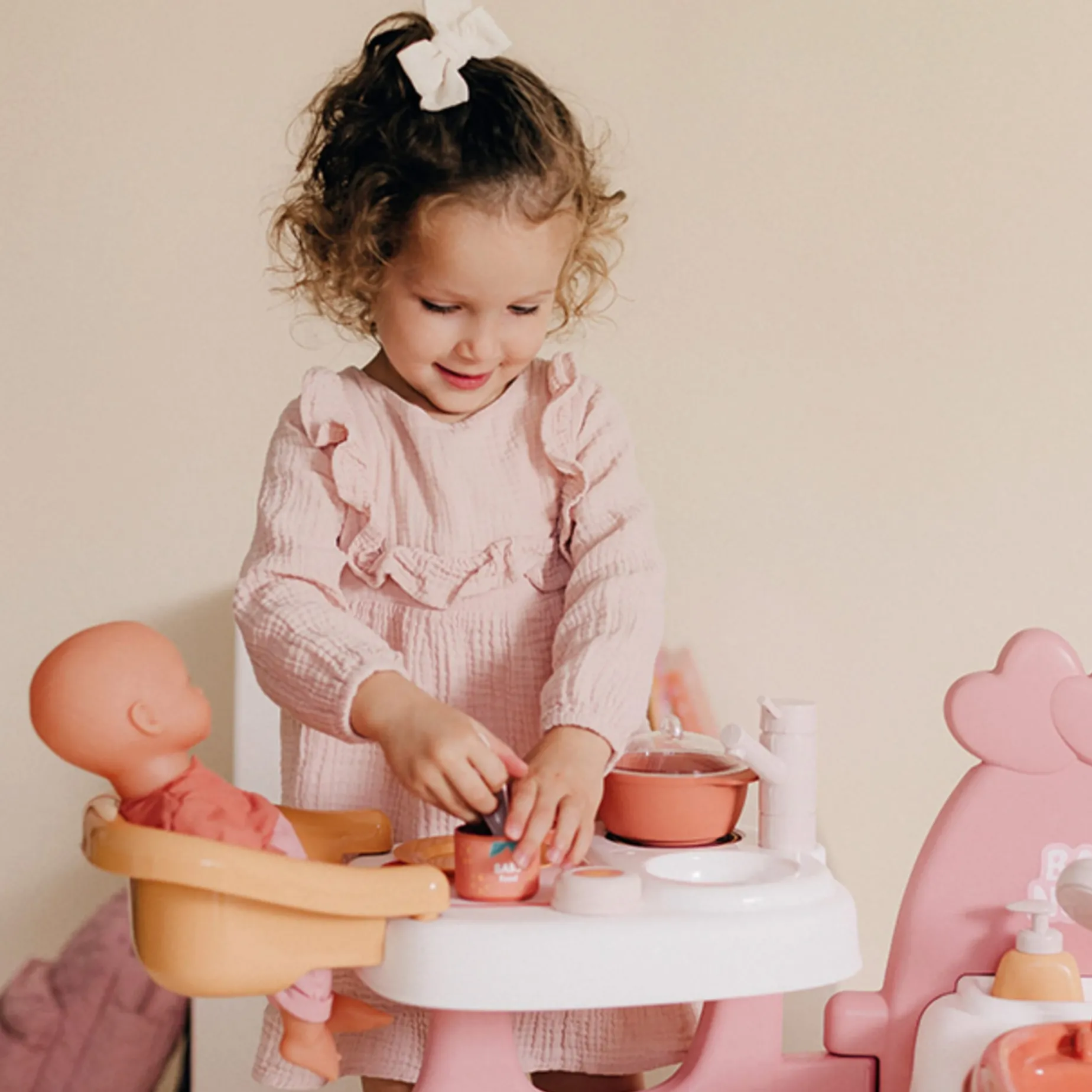 The Baby Nurse large doll play center offers a generous play surface so kids can care for their baby dolls for hours. It features 3 themed areas for pretend play: kitchen, bathroom, and bedroom.