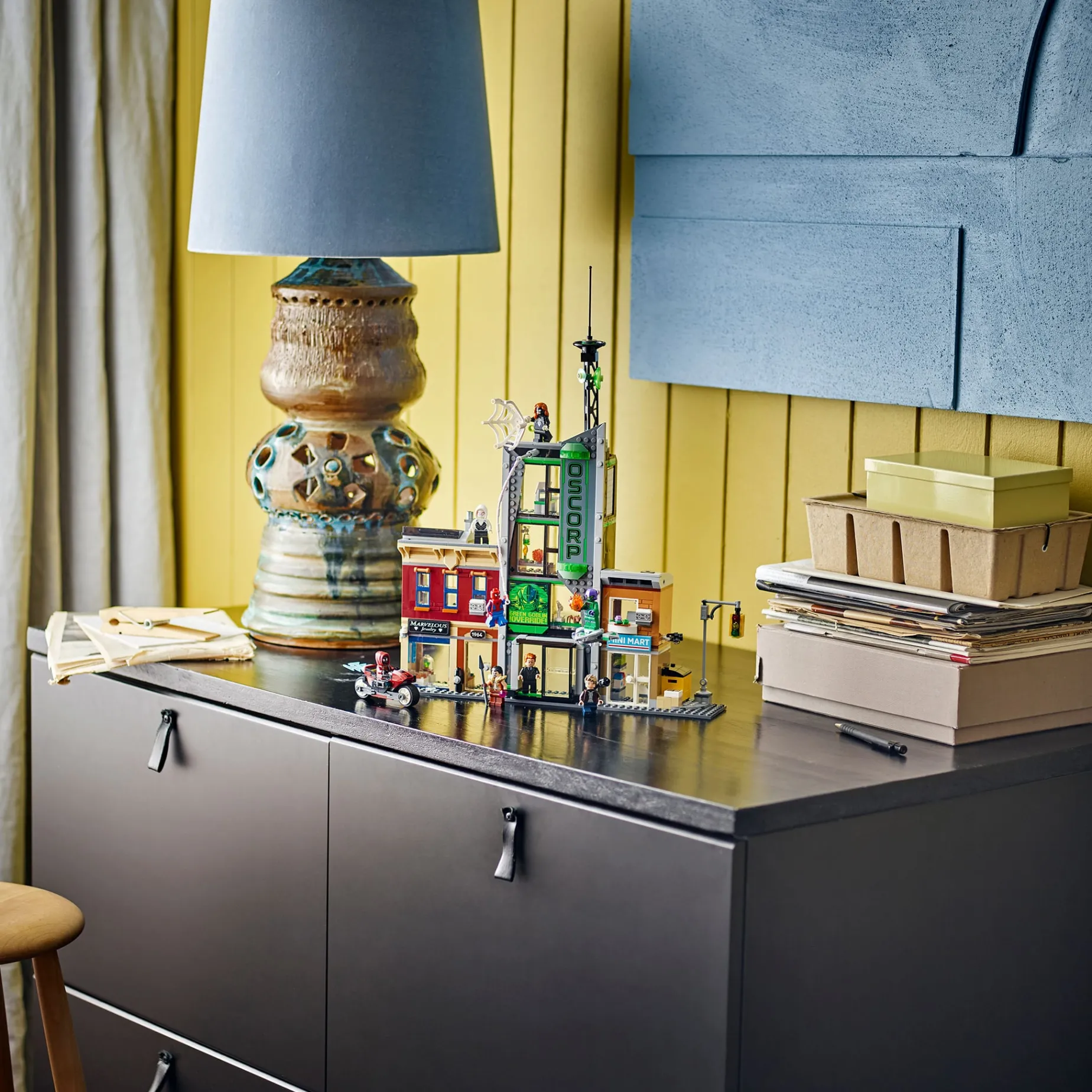The street scene includes three distinct buildings: Miles Morales’ apartment with a jewelry store below, the Oscorp building, and Venom’s apartment with a grocery store underneath. Each area is furnished with appropriate equipment and accessories. Eight LEGO minifigures from the Marvel movies provide endless action: Spider-Man, Spider-Woman, Miles Morales with his motorcycle, Eddie Brock, Ghost-Spider, Norman Osborn, Kraven the Hunter and Green Goblin with his glider. Transparent rods let kids pose and display the characters realistically. The LEGO Builder app lets friends and family share the building fun together. Contains 808 pieces.