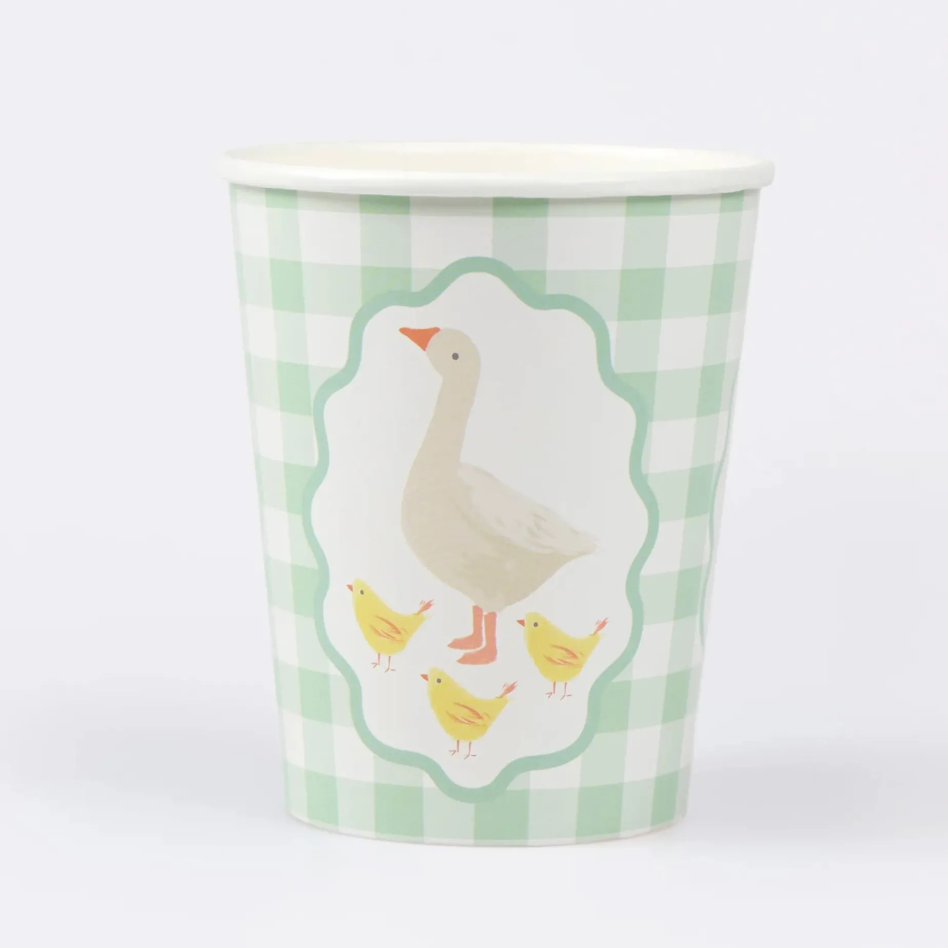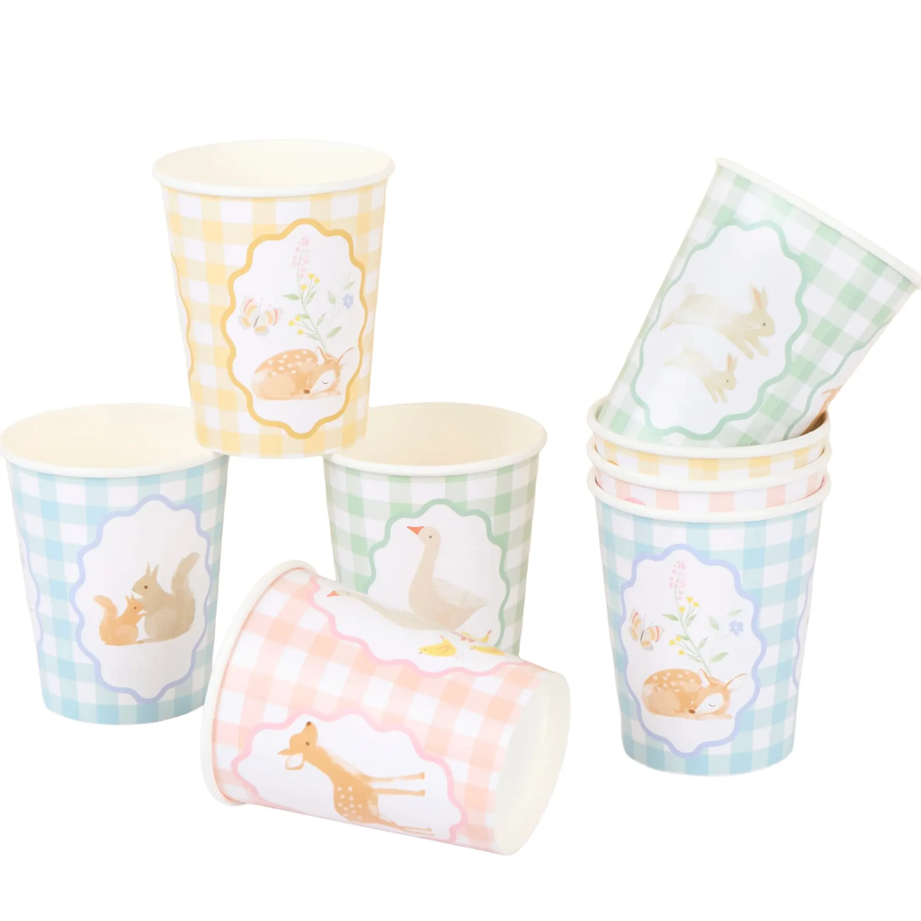 Our Little Animals range is brimming with storybook charm, inspired by vintage children’s books, 1940s animation and classic floral wallpaper. These paper cups feature soft watercolor animals, including geese, fawns, rabbits, squirrels and chicks, fawns; teamed with a timeless gingham design, to bring gentle beauty to your party table. Perfect for hot and cold drinks for young birthdays or baby showers.