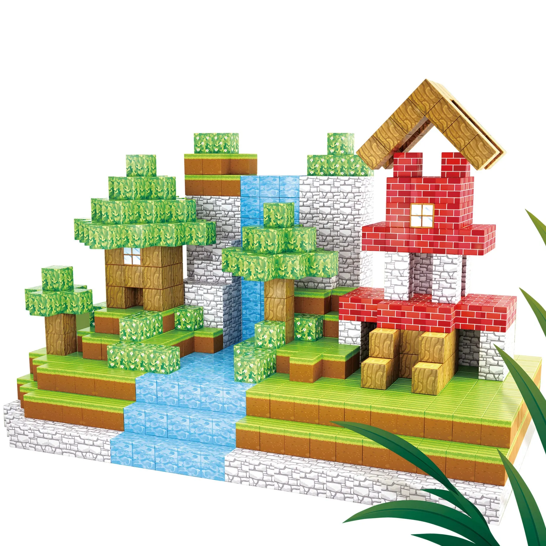 – Cubes printed with detailed designs: red bricks, gray stones, wooden trunks, green leaves, and blue water