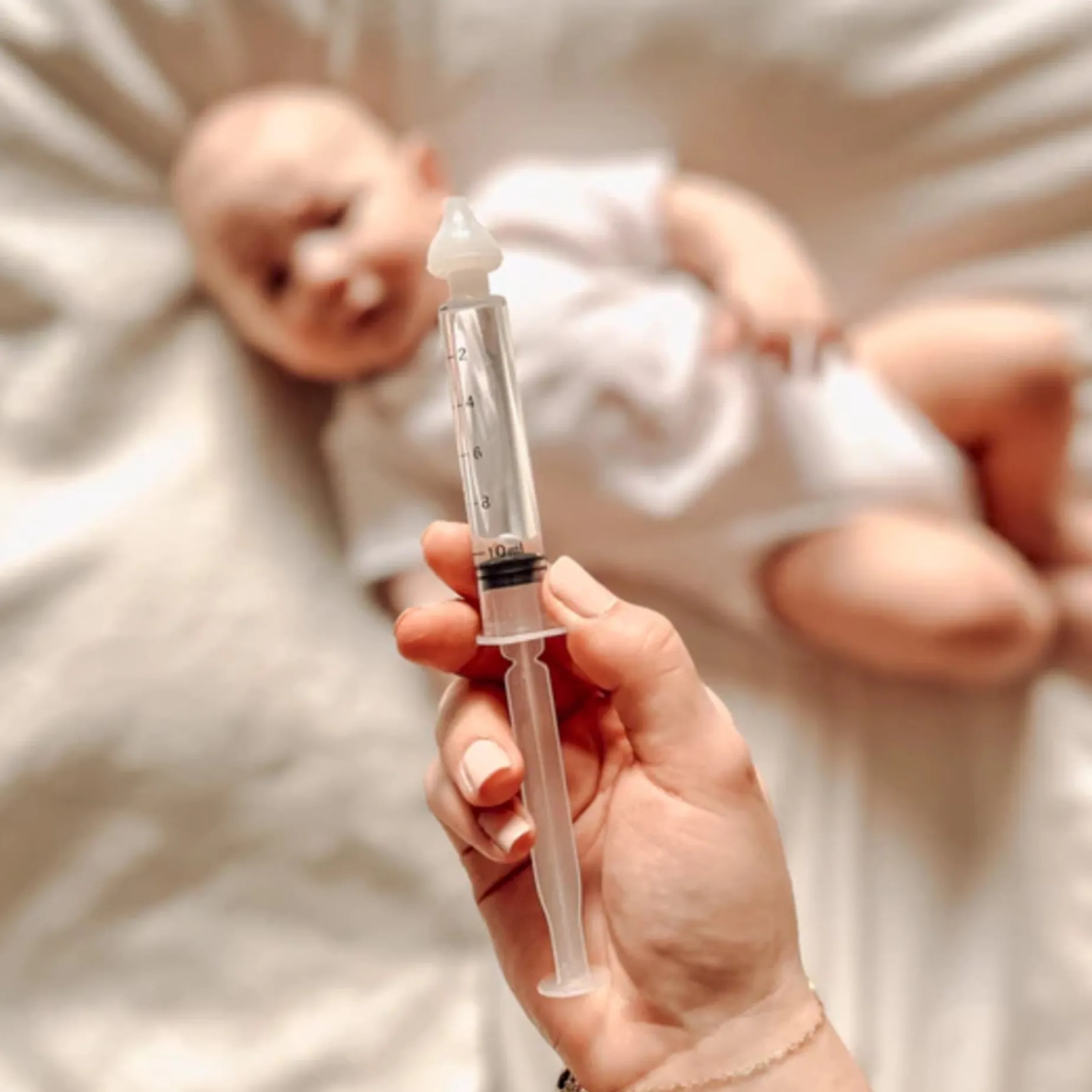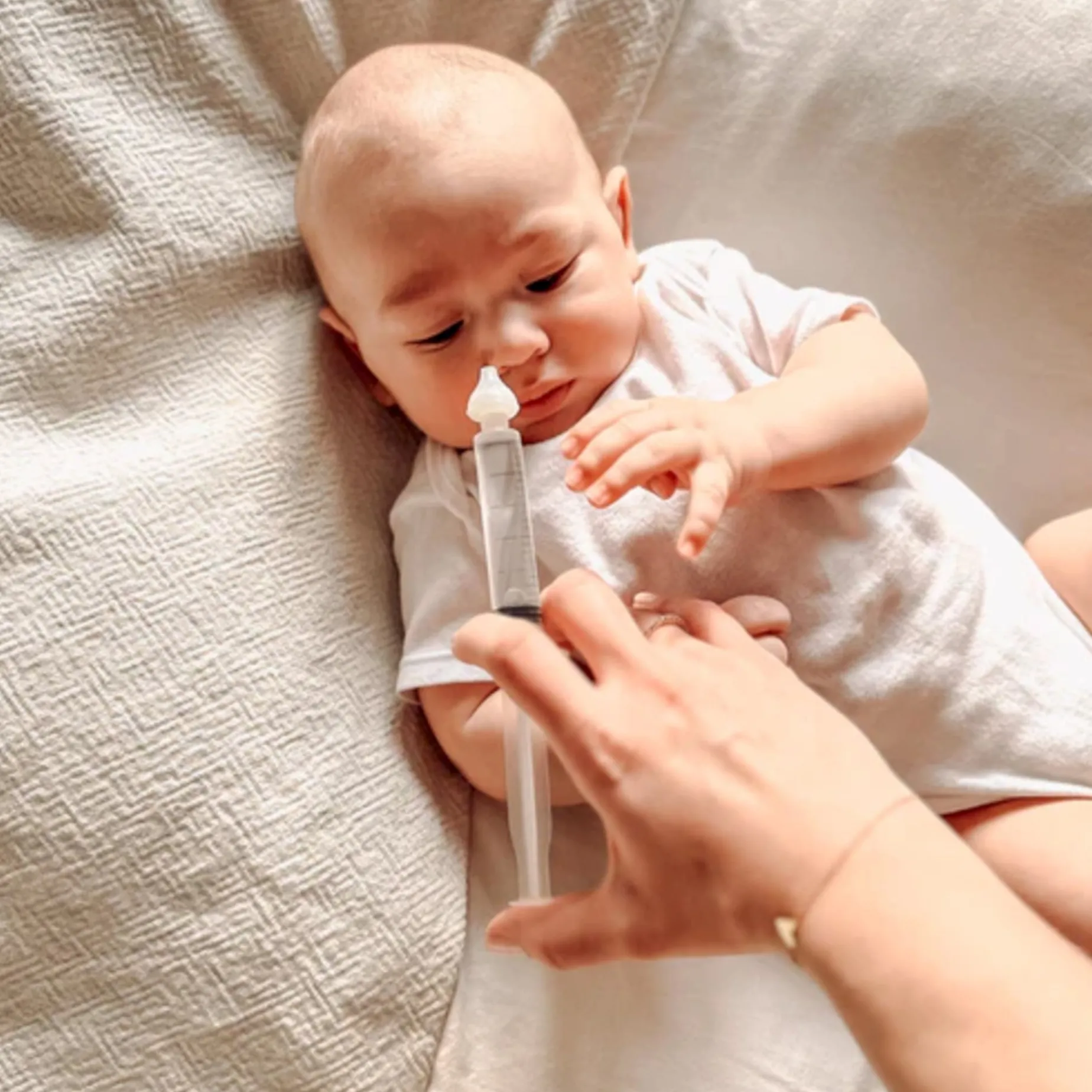 Lay your child on their side or back, swaddle if necessary, and place a washcloth under their nose. Irrigate the upper nostril when positioned on the side by gently emptying the syringe’s contents, about 1 mL per second. Secretions may come out through both nostrils, the mouth, or be swallowed. It is not necessary for the water to come out through the other nostril.