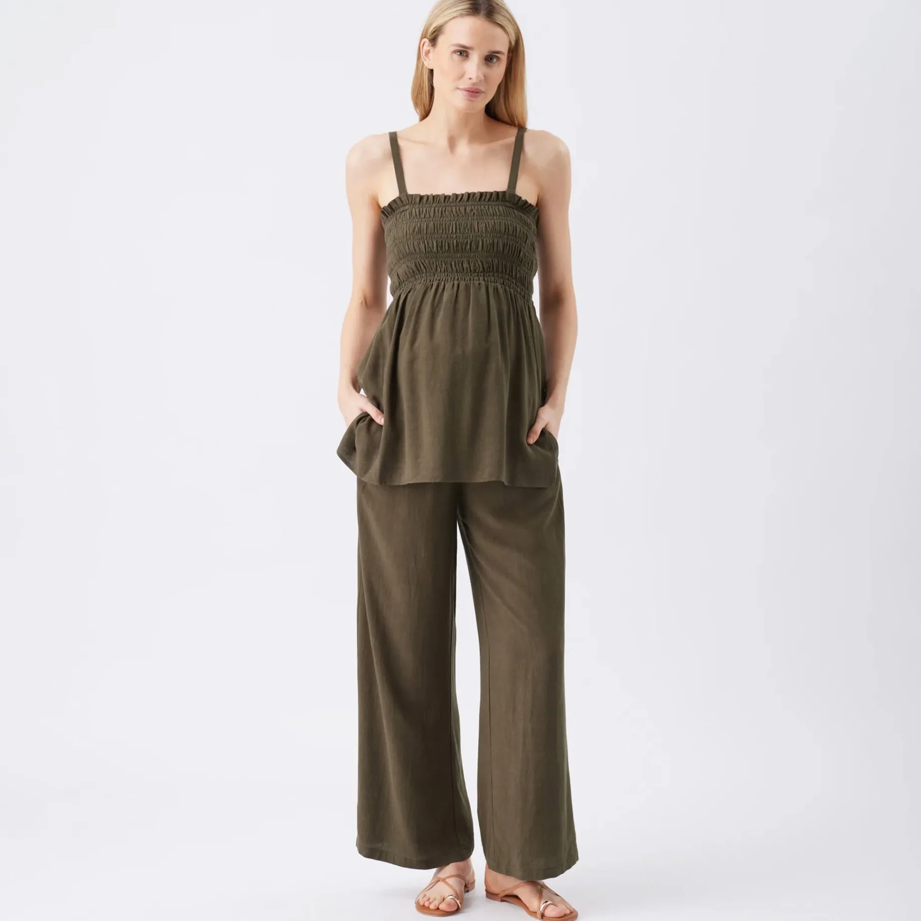 These pants are a must-have for warm-weather wardrobes. Crafted from a soft linen blend, the pants feature an easy to pull-on and comfortable shirred waistband that ensures they will be on high rotation throughout pregnancy and as you recover postpartum. Complete with side pockets, and adjustable draw string.