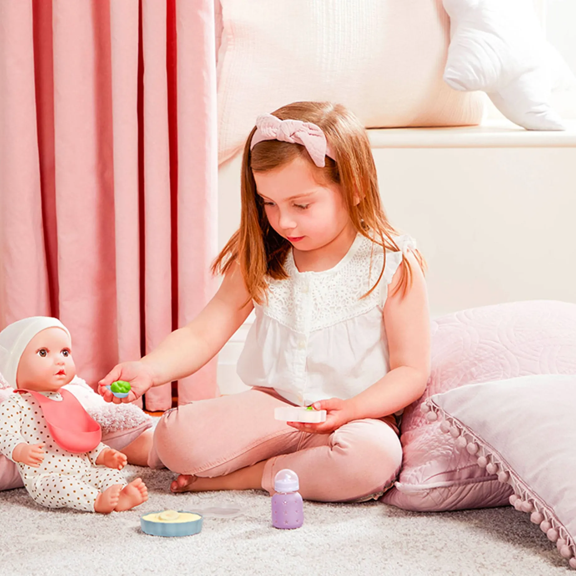 -Babi’s feeding set includes: 1 bib, 1 bottle with lid, 1 bowl of oatmeal with bananas, 1 snack container with lid, 2 pieces of broccoli, 2 cookies and 1 spoon