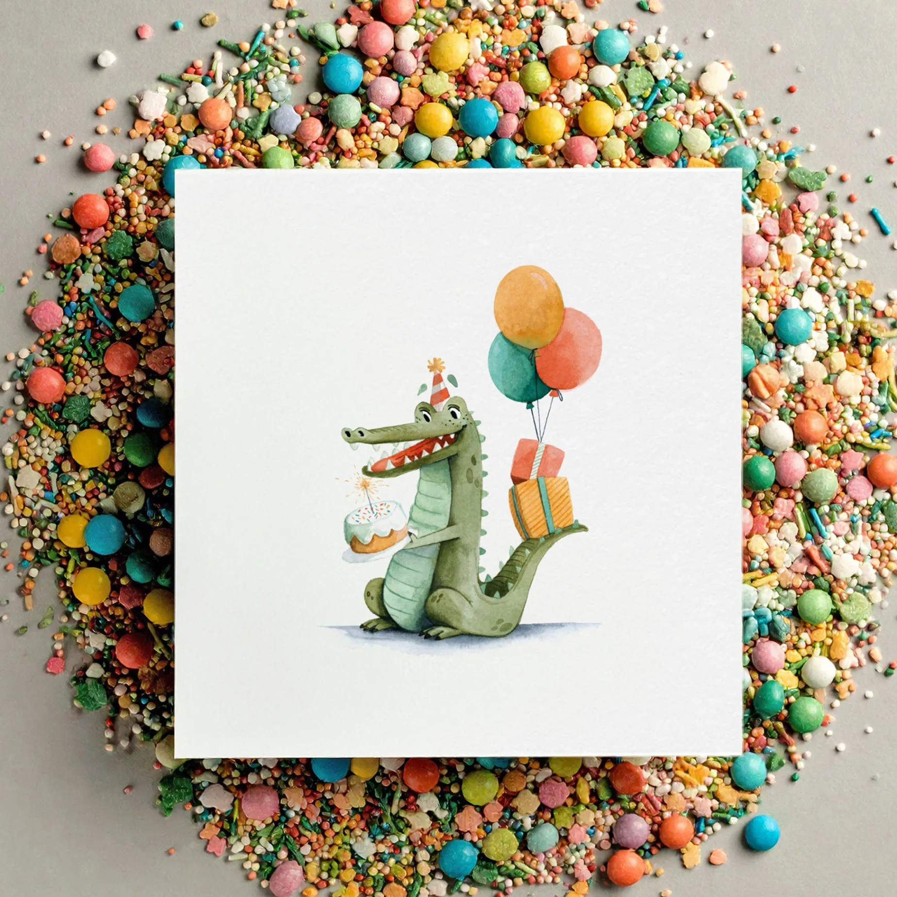 – Illustrated card featuring Rocco, our charming little crocodile