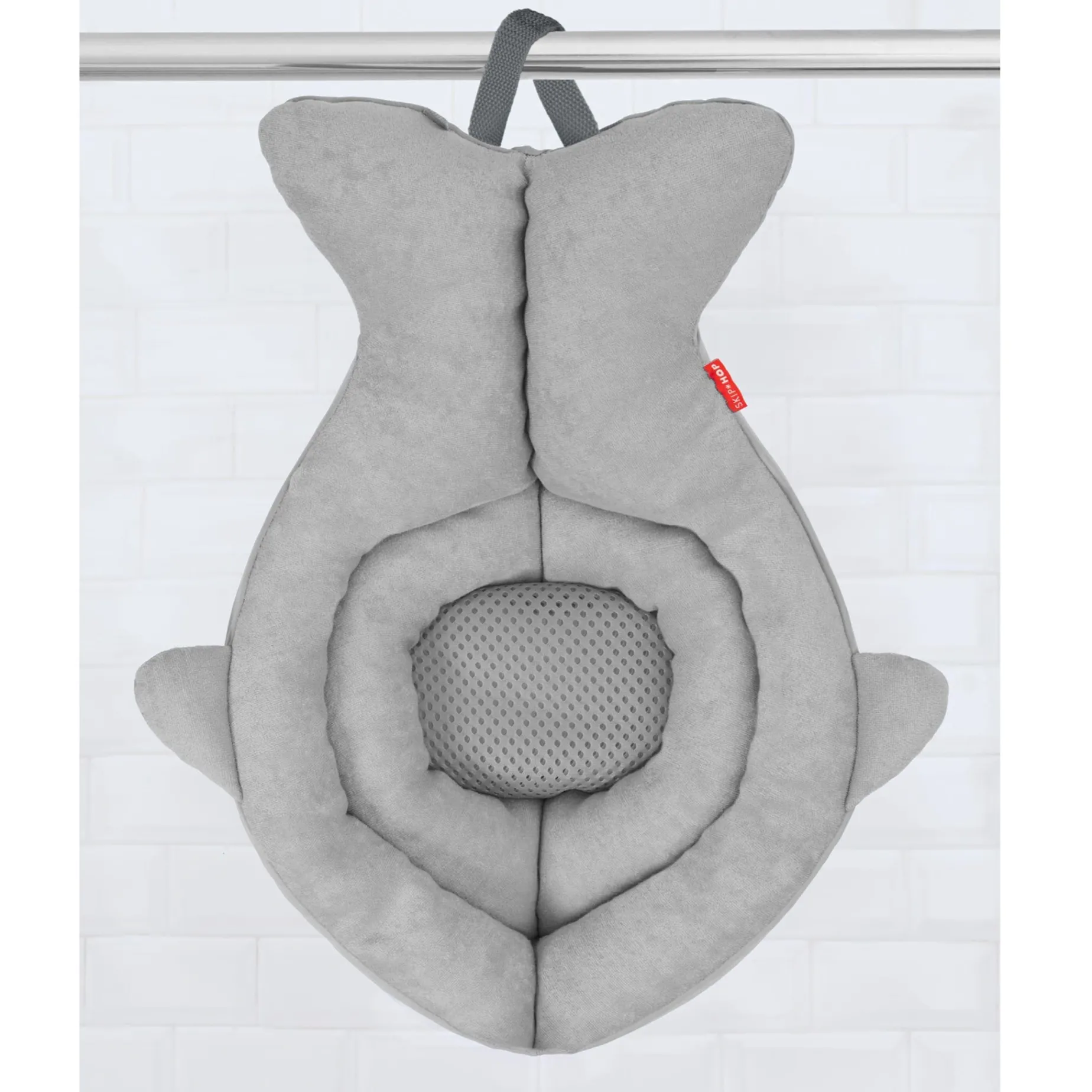 -Plush, contoured whale shape cradles baby for comfy first-time bathing