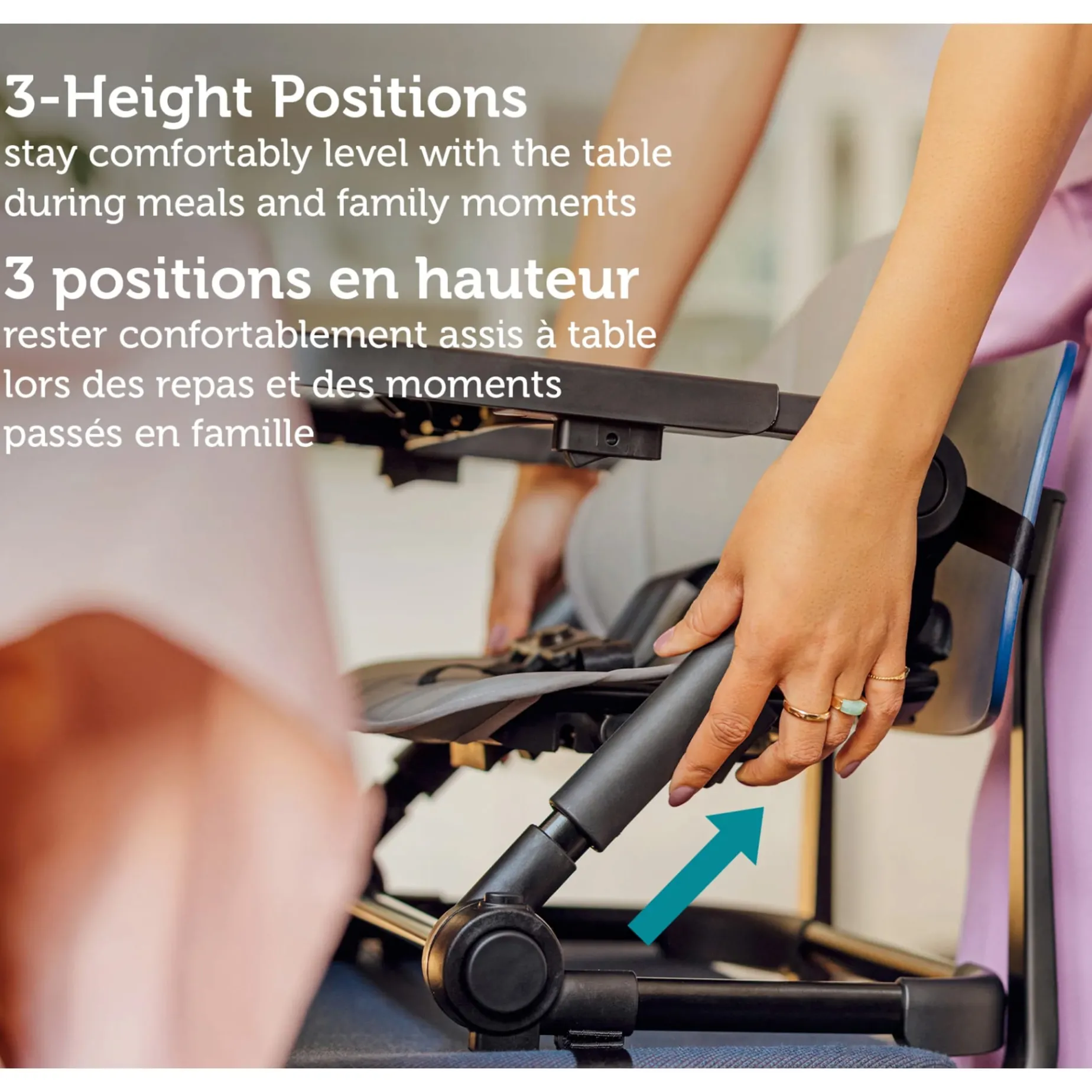 – Three adjustable height positions grow with your child, keeping them comfortably level with the table during meals and family moments.