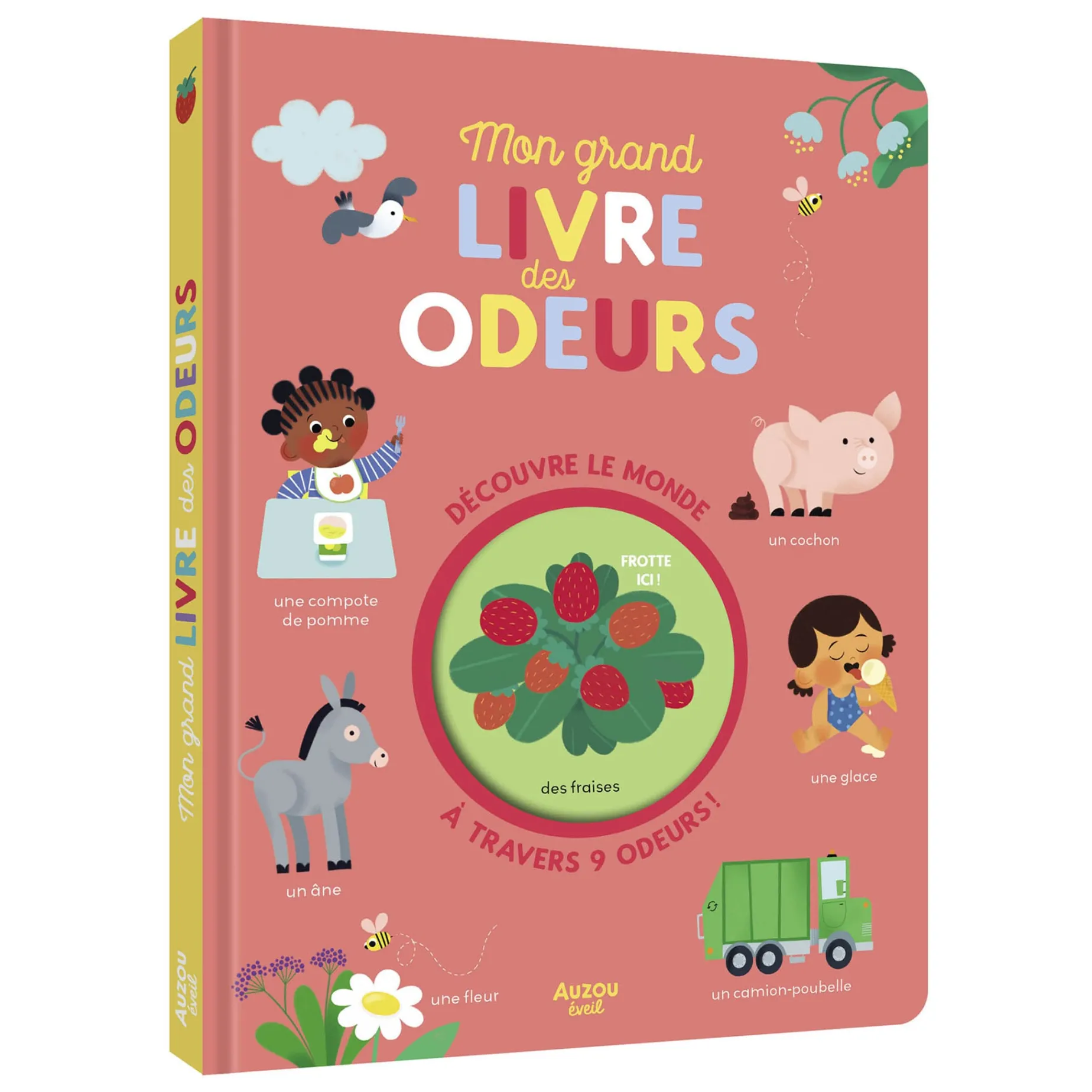 Dans ce beau livre, le tout-petit découvre ses premiers mots avec 9 univers thématiques adaptés (la ferme, la crèche, la cuisine, la mer…), un imagier en page de gauche et une belle et grande illustration en page de droite.Sur chaque double-page, un grand flap à soulever pour découvrir une odeur cachée et liée à l’univers de l’illustration !Le sens olfactif permet une découverte ludique et facilite l’appropriation du nouveau vocabulaire et sa mémorisation. Pointer, nommer, enrichir son vocabulaire et développer son odorat : un livre d’éveil à manipuler d’abord avec le parent accompagnateur, puis tout seul.