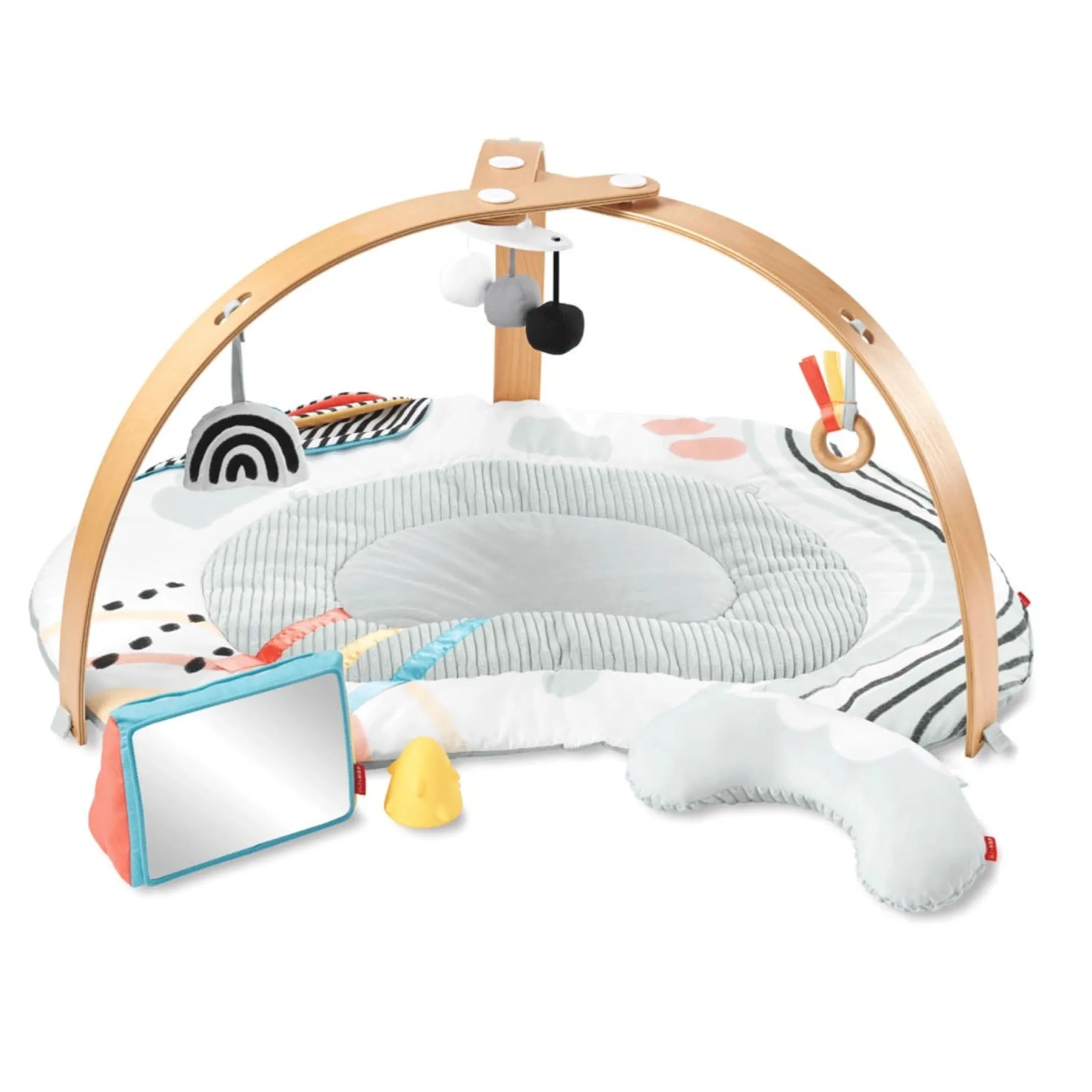 Designed in collaboration with experts in Montessori education, our Discoverosity Play Gym offers a balance of calming simplicity and an engaging sensory environment to nurture baby’s natural curiosity and development—from vision and concentration to fine motor skills and more. Crafted with sustainably-sourced wooden arches and a plush sensory playmat, the five nature-inspired developmental toys include contrasting patterns, crinkle sounds, a baby mirror and more to encourage self-directed activity and exploration. Six parent cards guide you through the gym’s milestone-driven play so you and baby can discover, learn and grow together.