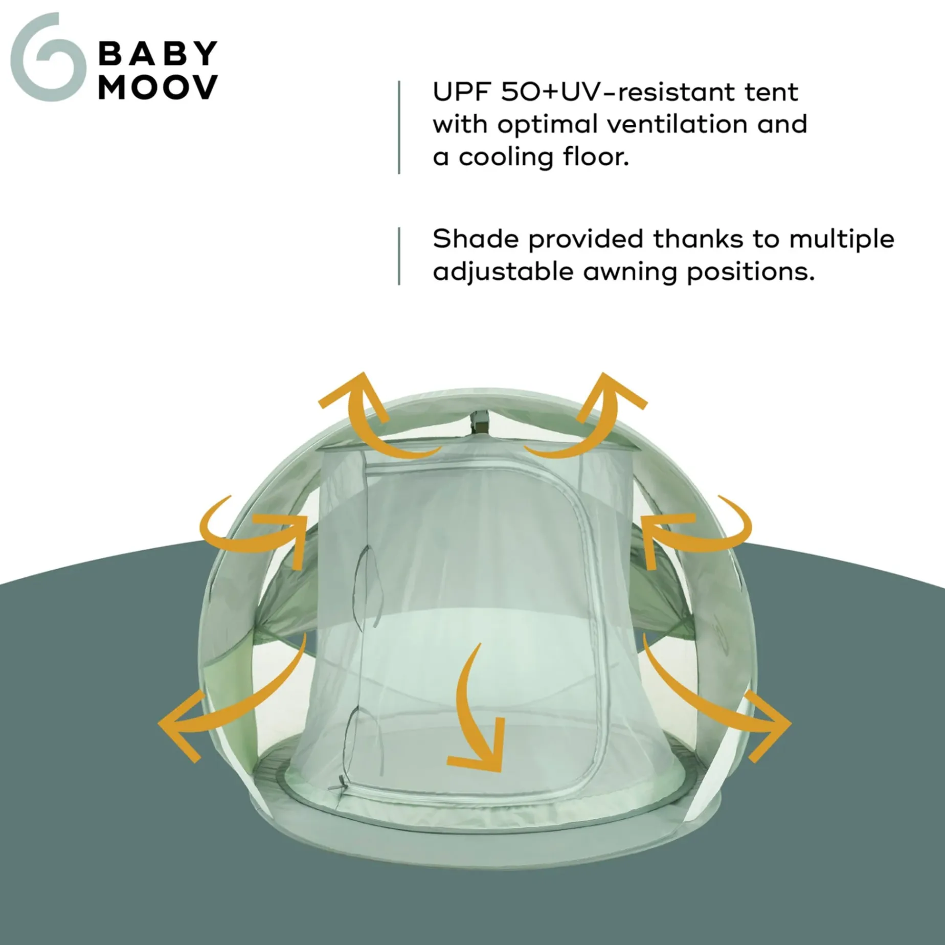 Moov and Protect Anti-UV, Cooling Beach Tent. Keep your baby safe and comfortable on sunny days with the all new Moov & Protect Beach Tent, designed to create a shady, breezy haven for your little one at the beach, park, or poolside.