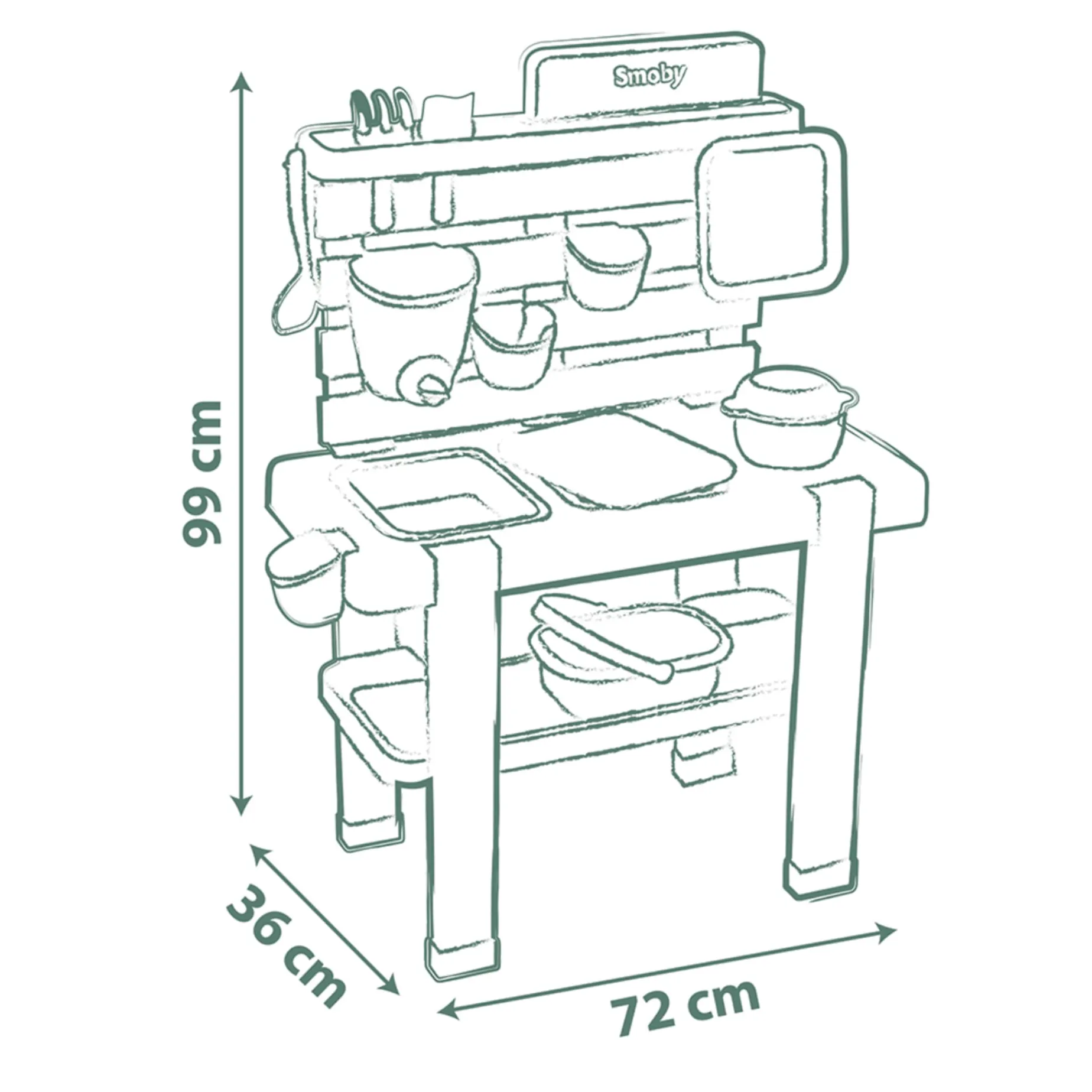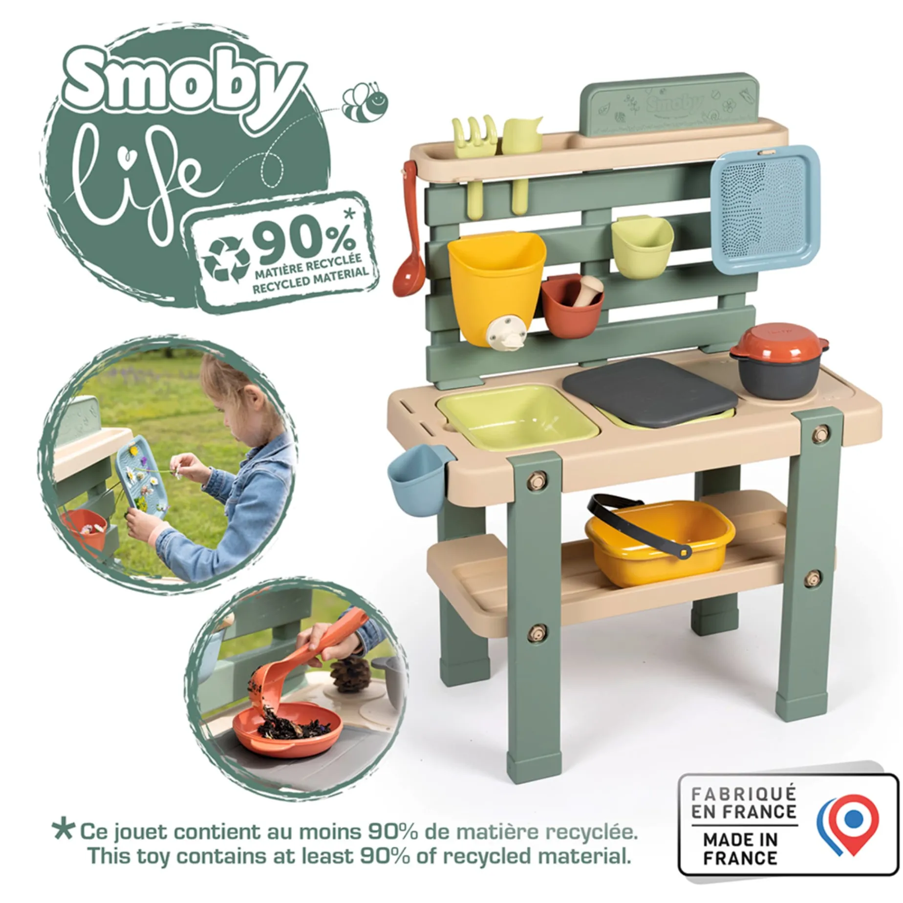 Once you’ve found the perfect spot in the garden or on a terrace, all you have to do is put your imagination to work and have fun! A bit of soil, a few blades of grass, some water, some pretty flowers… And why not prepare your own planting on this potting table? You can imagine anything with this toy made from 90% recycled material.