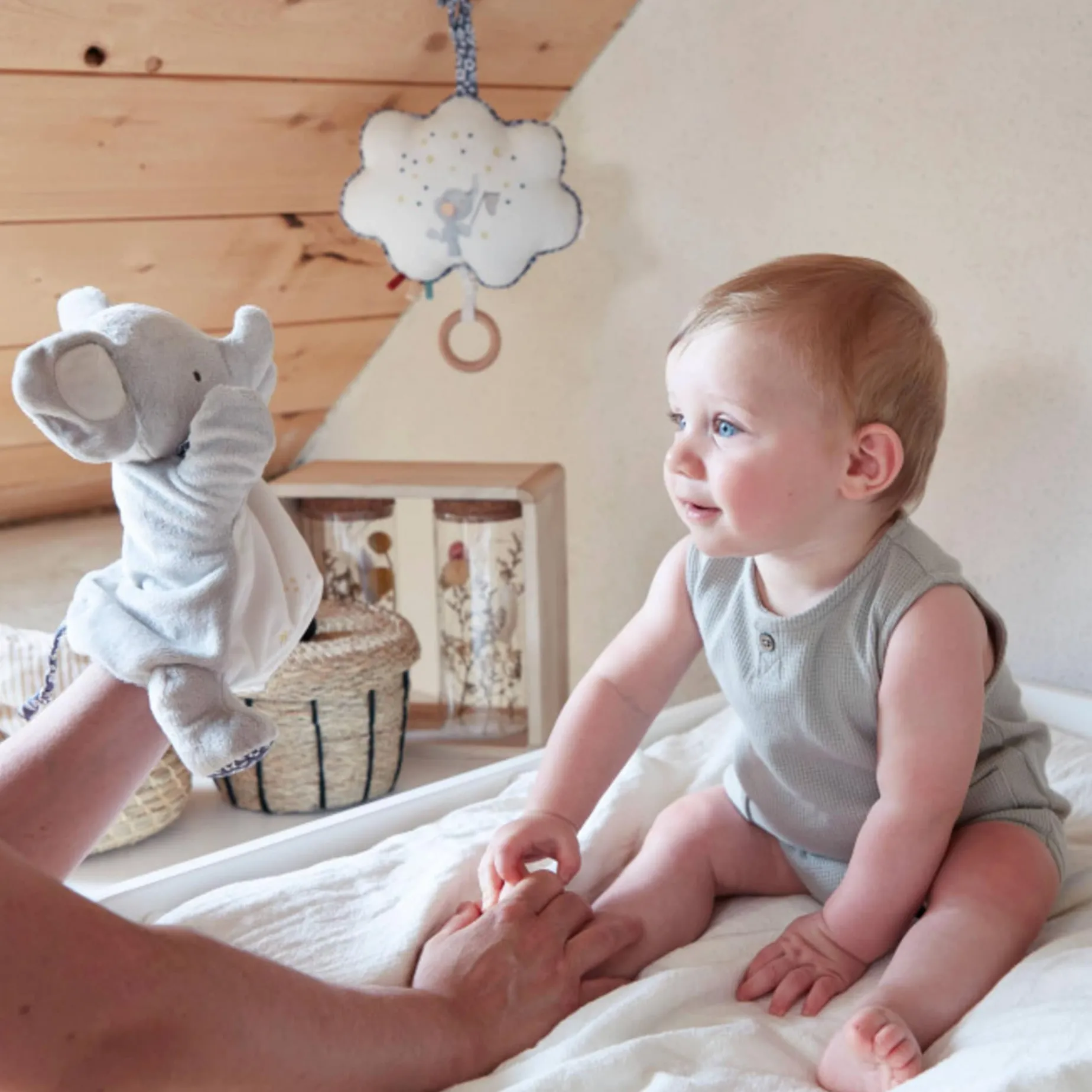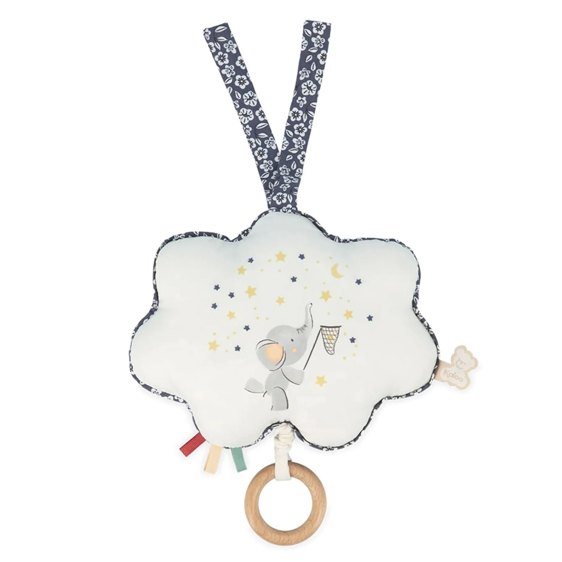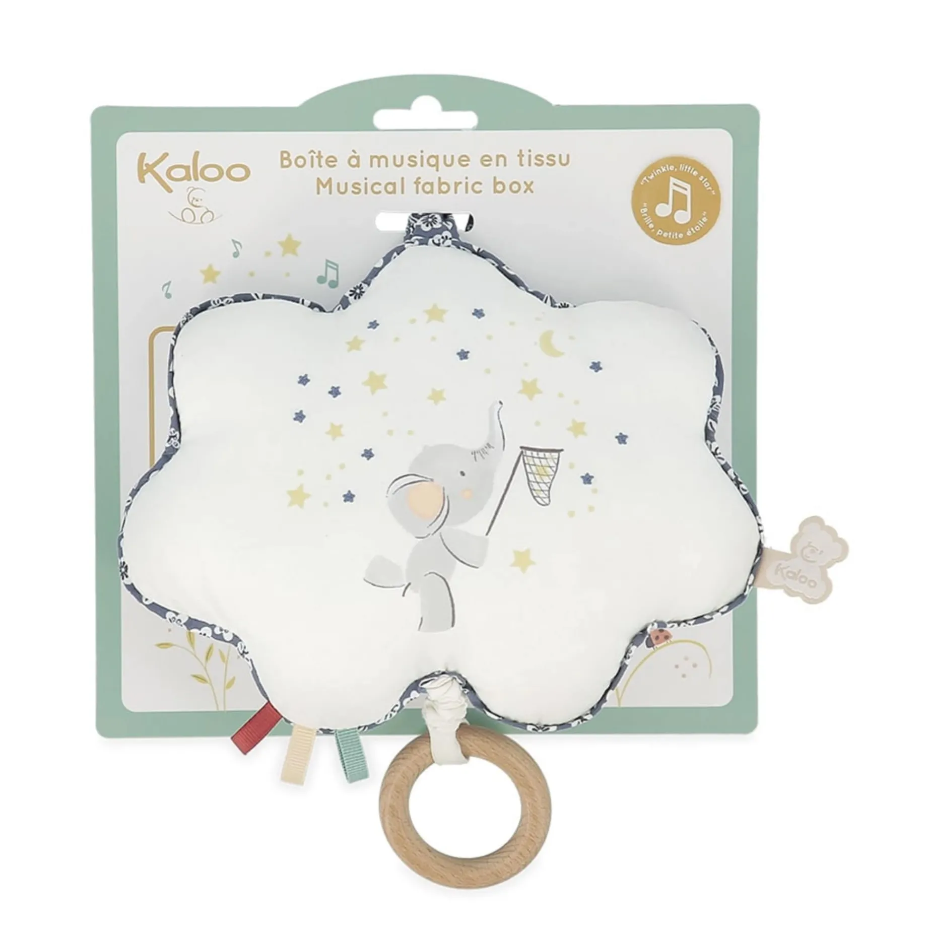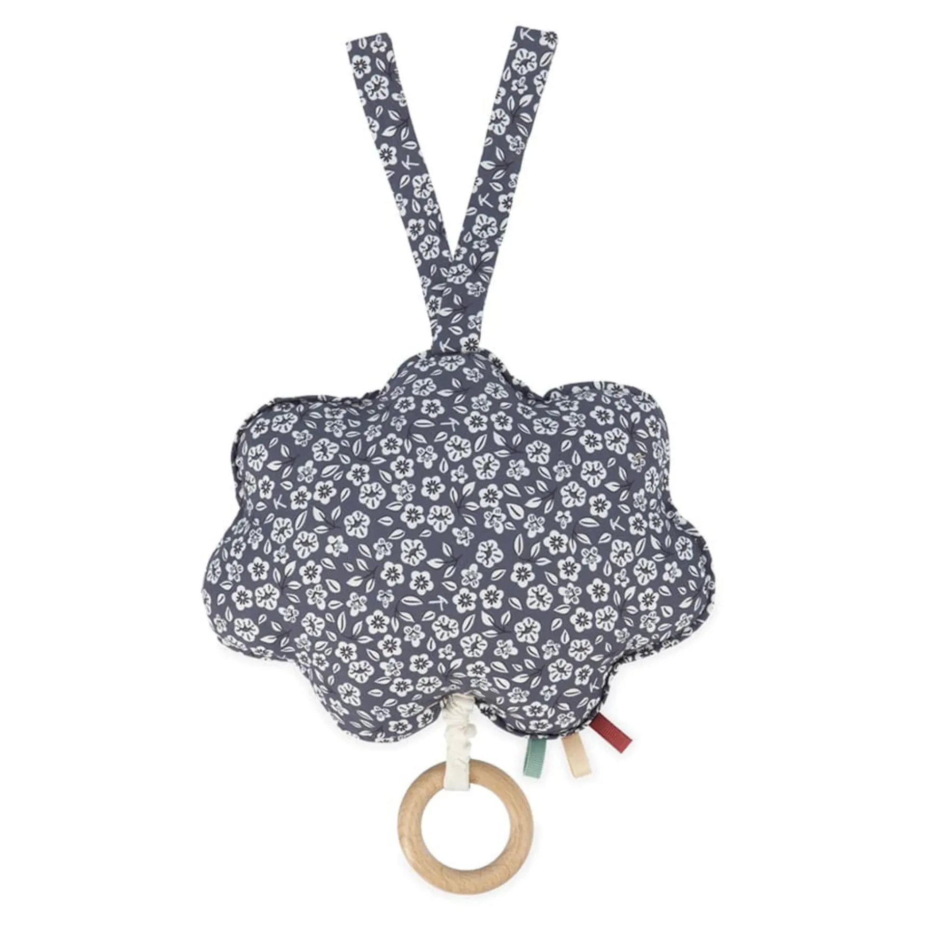 Play the nursery rhyme “Shine, shine little star” to baby with this soft musical cushion. A beautiful fabric music box to hang near the toddler thanks to its ribbons, for a melodious touch of tenderness in everyday life. Just pull the wooden ring for the nursery rhyme to start and awaken all of the child’s senses: musical awakening, development of language and imagination… This musical cushion embroidered with sweet illustrations on the theme of “Shine, shine little star” is in poplin and composed of recycled polyester padding certified GRS. The beech wood ring is easy to grip by baby, who will enjoy using his beautiful music box himself as he grows. Easy to maintain, the cushion contains a waterproof musical box and can be washed by hand on the surface.