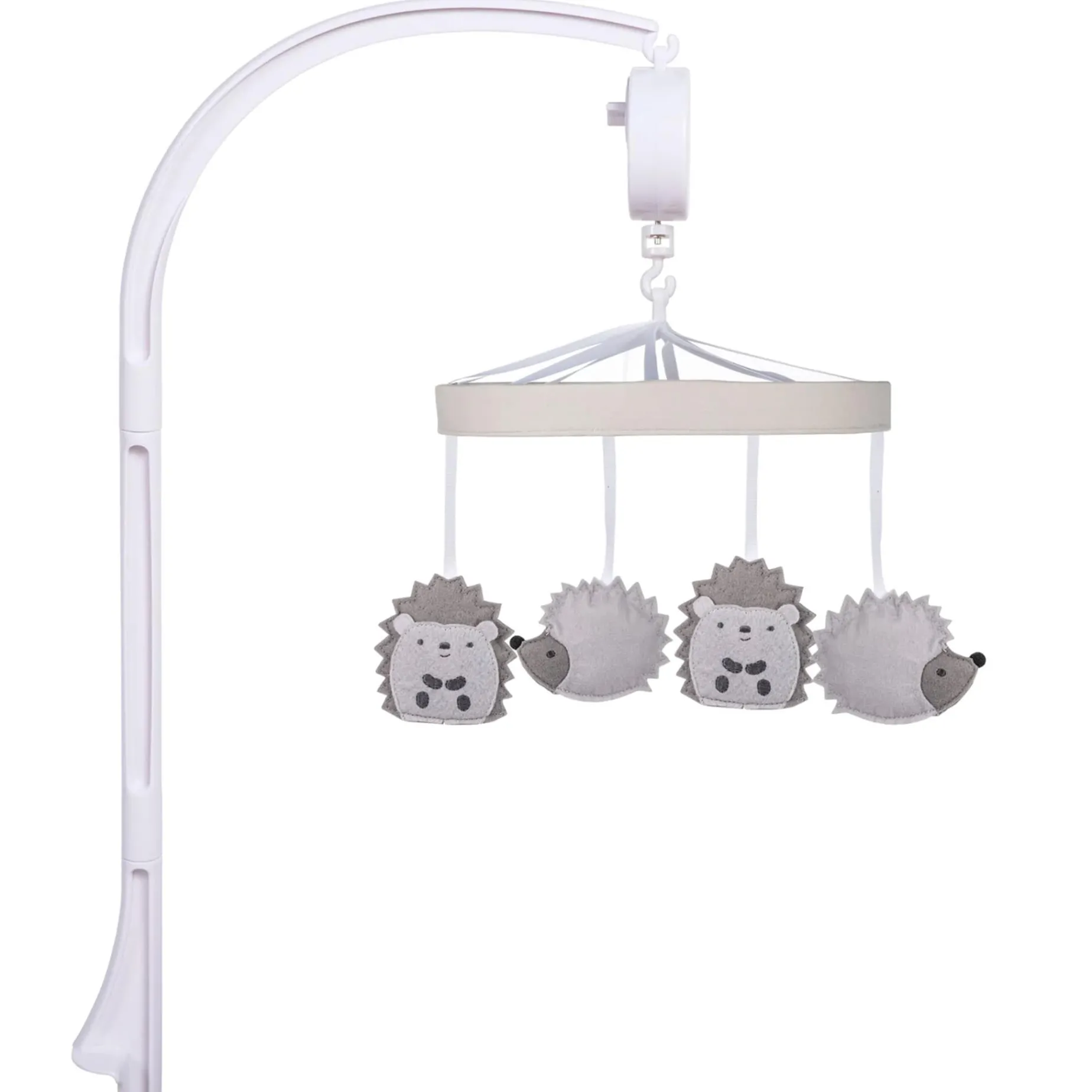 Encourage eye tracking and sound perception skills with the Hedgehog Musical Crib Mobile by Sammy & Lou. Featuring a gray, 9-inch banded mobile ring, this mobile has two different gray hedgehogs suspended from decorative white ribbons to slowly rotate to Brahms’ Lullaby. This mobile coordinates with Sweet Autumn and Enchanted Garden bedding collections by Sammy & Lou.