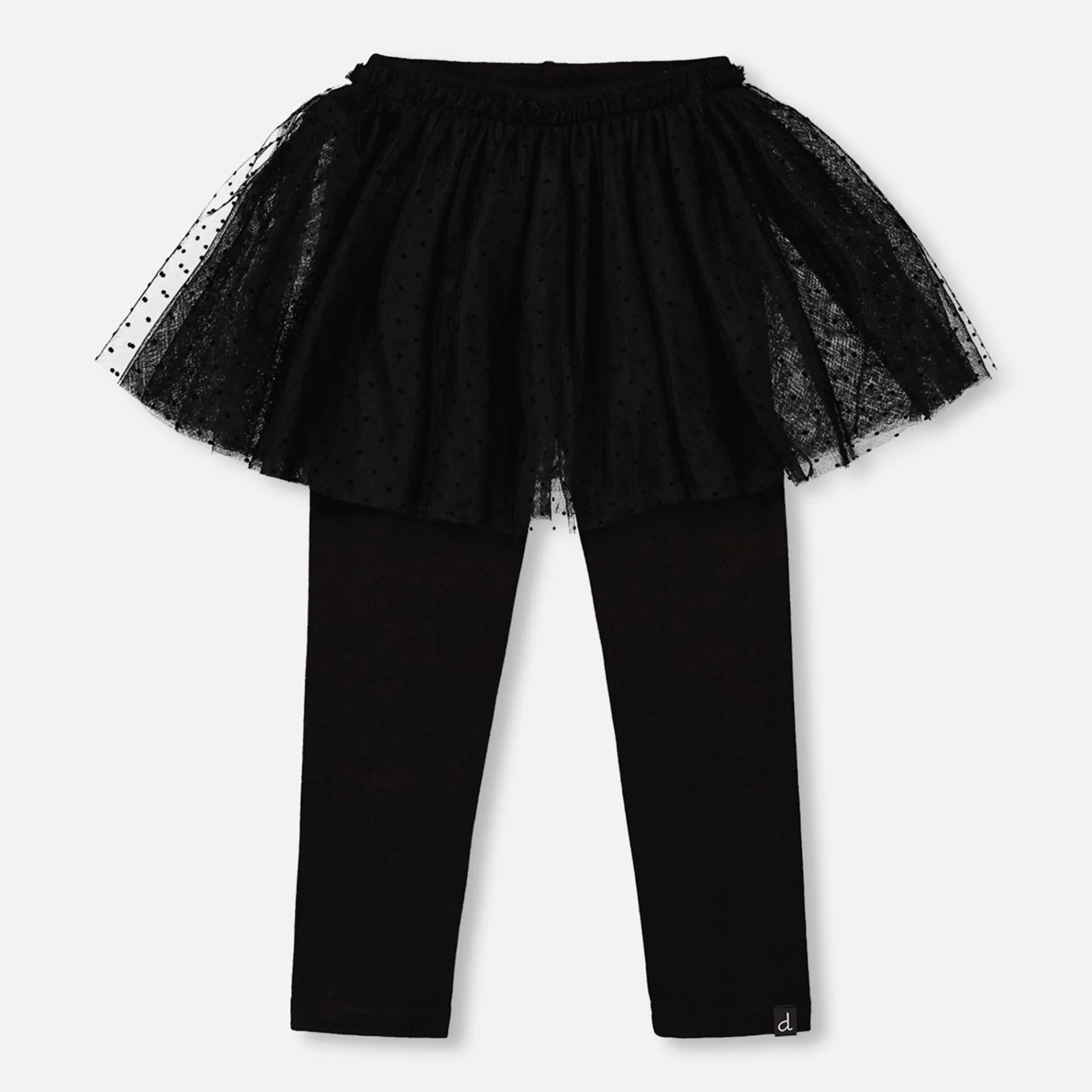 A tulle skirt overlay adds texture and whimsy to these oh-so-essential bottoms. A must-have for the girly girl who loves the comfortable feel of leggings, this adorable one-piece design features a stretch elastic waistband, a vertical ribbed texture, and a flared tulle skirt with an allover dot pattern.