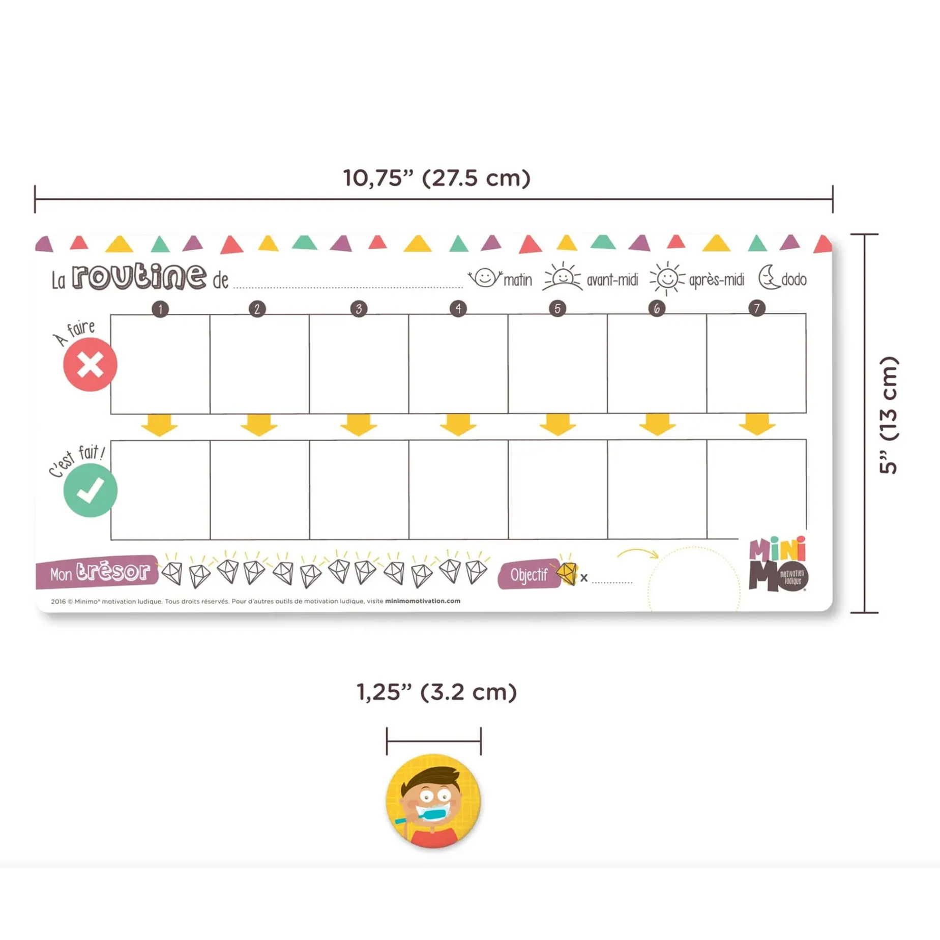 -Aimants inclus (utilisation suggérée) : Déjeuner, Collation, Repas x 2, Brossage des dents x 2, Lavage des mains x 2, Lavage des cheveux, Coiffure/brossage des cheveux, Toilette x 2, Médicaments/vitamines, Bain, Habillage, Pyjama, Histoire, Dodo, Habillage pour l’extérieur, Quitter la maison, Rangement des vêtements, Rangement des jouets, Soins aux animaux, Aimants à personnaliser x 2