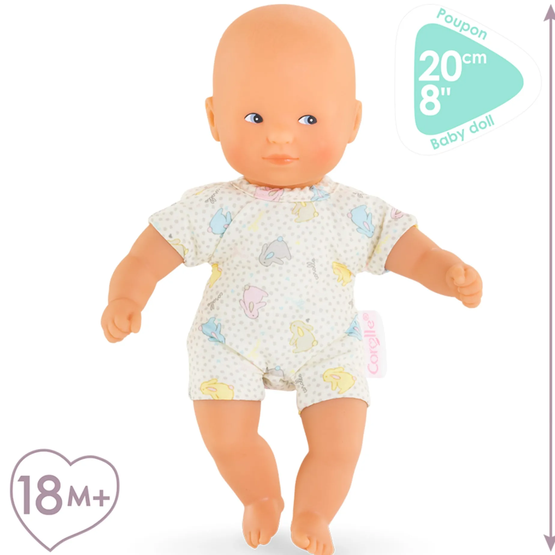 This 8-inch (20 cm) mini doll is lightweight and easy to carry everywhere. She has white skin and blue painted eyes. Her face, arms, and legs, with a delicate vanilla scent, are made of soft-touch vinyl. She wears a pretty bunny-print cloth body.