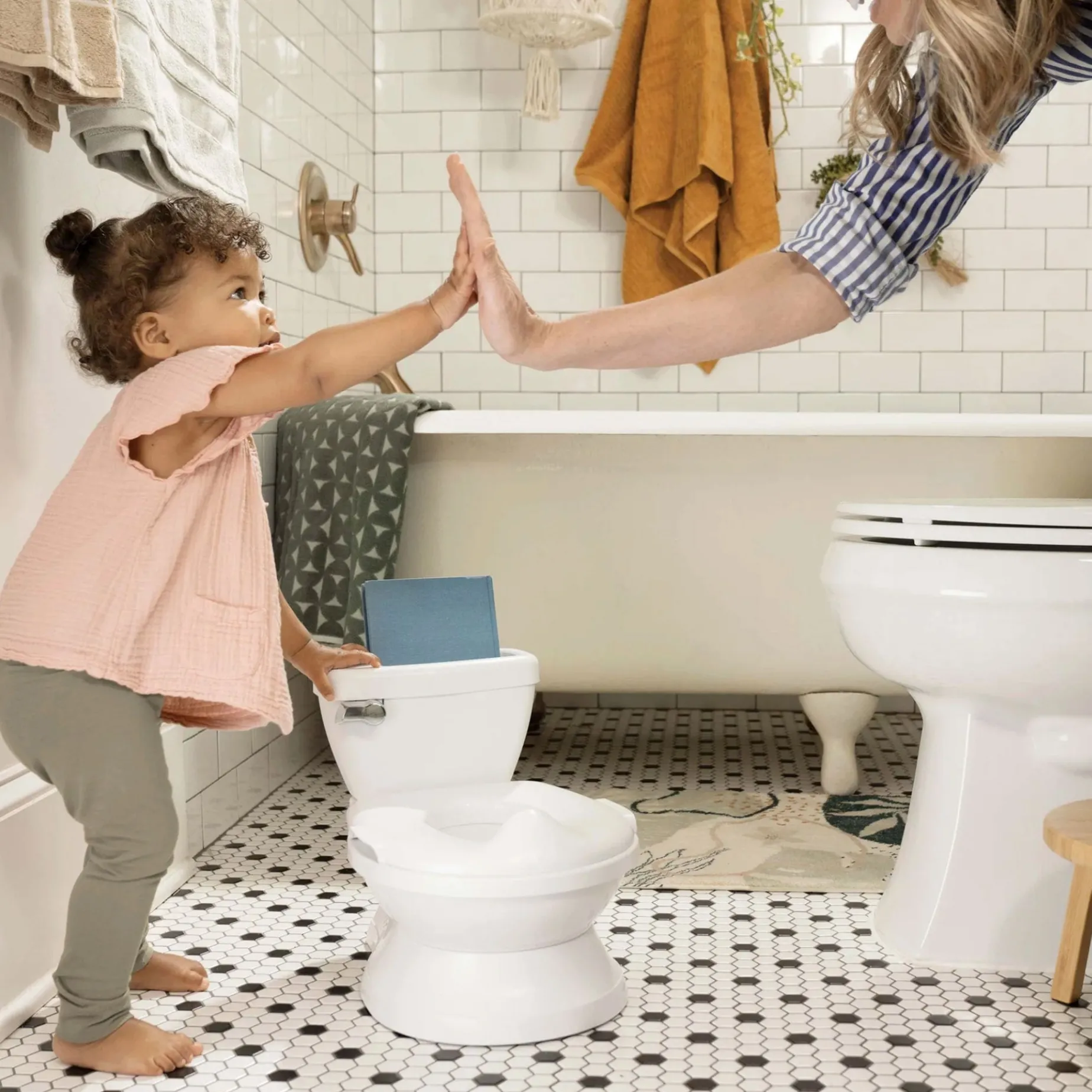 Potty training is easier (and more fun) with the Summer by Ingenuity My Size Potty Pro. Designed to look and feel like a real adult toilet, the My Size Potty Pro is a toddler floor potty that helps to ensure a comfortable and confident progression to the real thing. The chrome-style toddler potty handle makes a realistic flushing sound that rewards your little one for a job well done. The removable potty topper can be used as a toddler toilet seat on an adult toilet to help your toddler become a potty training pro. A built-in storage compartment is spacious enough to hold books, a tablet, wipes, and anything else your little one needs to promote healthy habits during the potty training process. With a removable bowl and integrated splash guard, the My Size Potty Pro is easy to clean – perfect for all of toilet training’s messy moments.