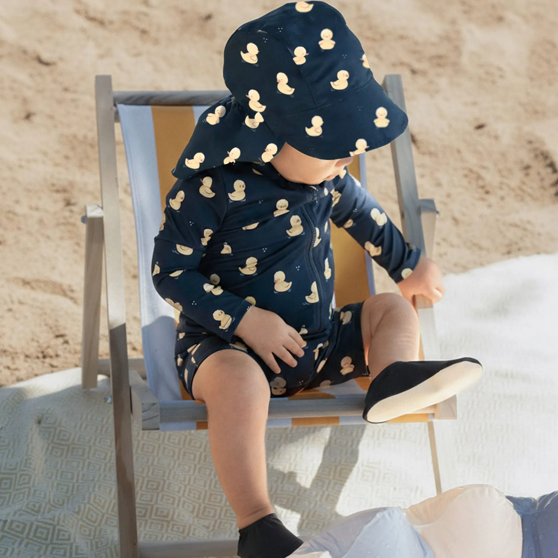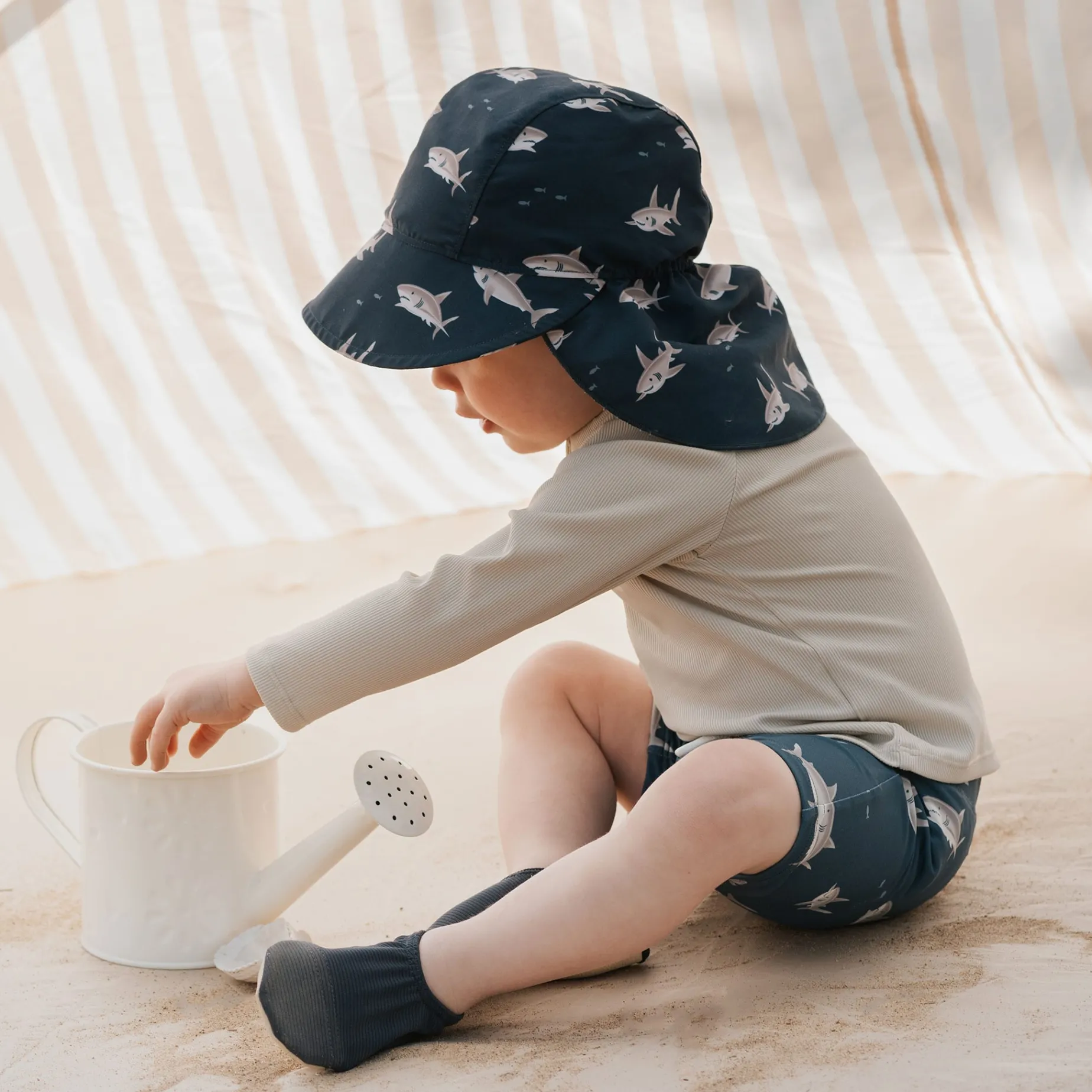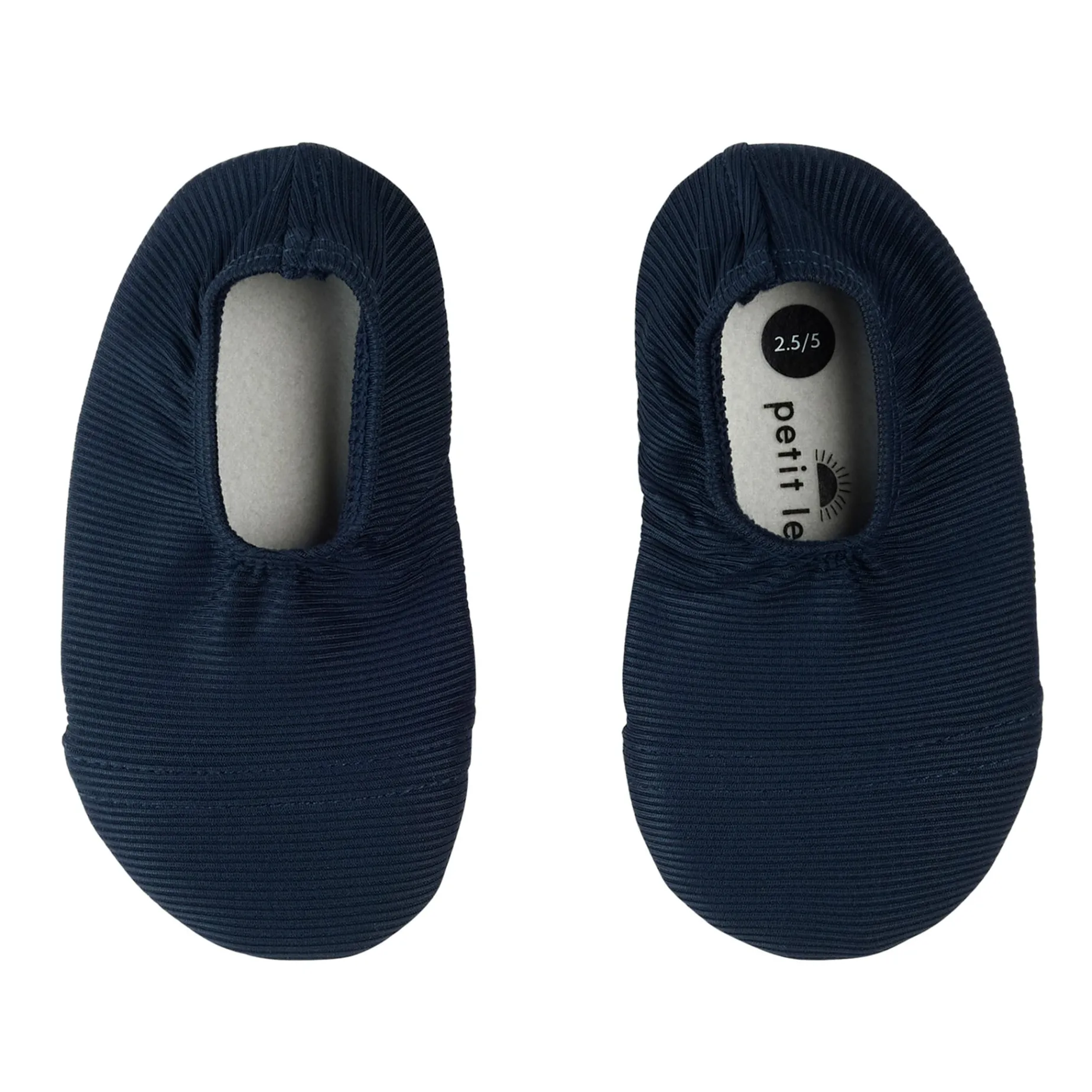 For little feet on the move, these navy water shoes are an essential for your next vacation. Perfect for slippery pools, hot sandy shores, and rocky beaches, the anti-slip sole gives them the confidence to explore. Â The textured, quick-drying material keeps feet comfortable all day, while the gentle elastic around the toes and ankle secure the shoes in place through every wiggle and wave.