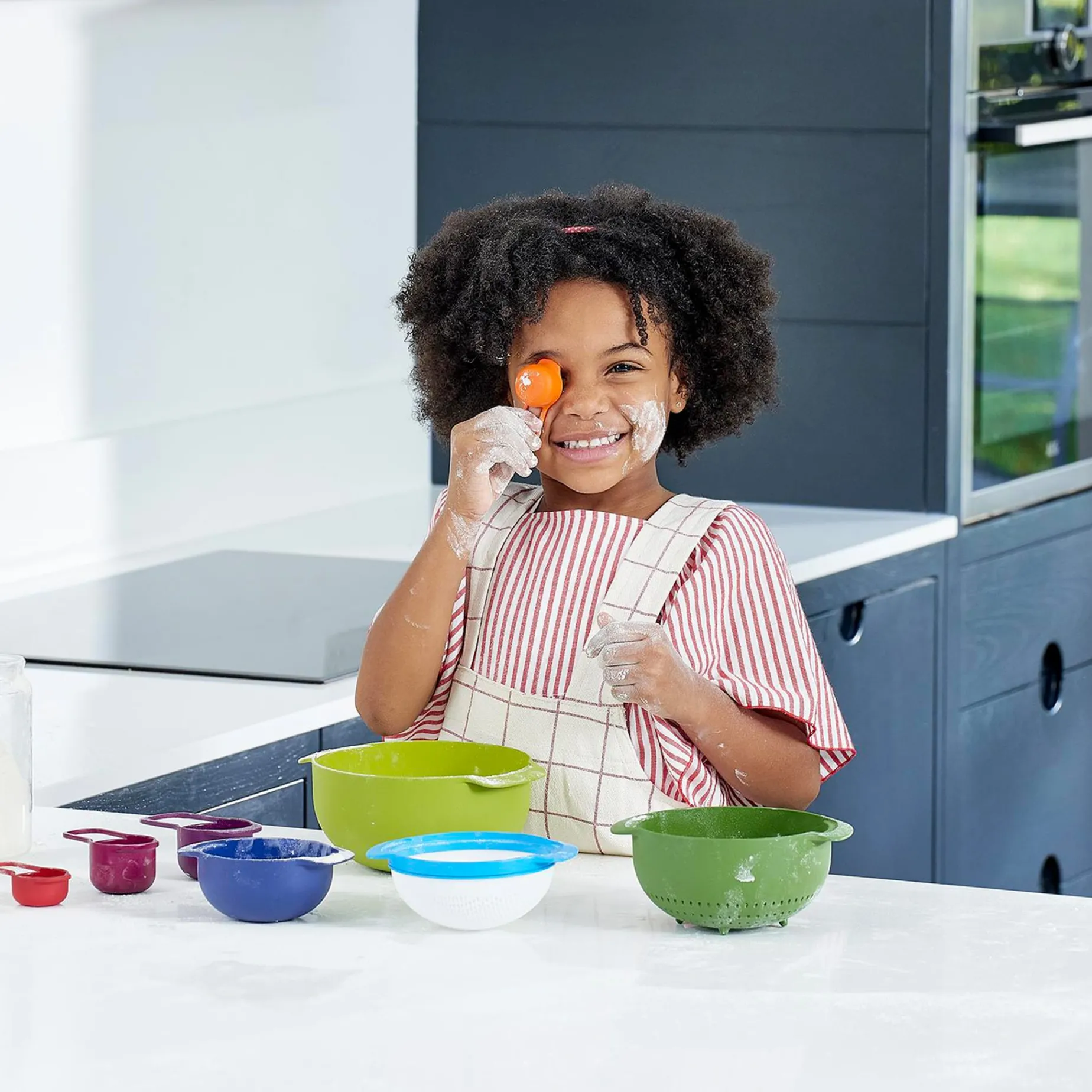 The joseph joseph nest 9 looks and works just like the real thing, featuring nine different kitchen tools for non-stop cooking and baking. With five interlocking measuring cups (you will find units labelled on the base of each cup), a medium mixing bowl, large mixing bowl, mesh sieve and colander to play with, it’s safe to say that kitchen pretend play just got a massive upgrade! little ones won’t know where to begin!