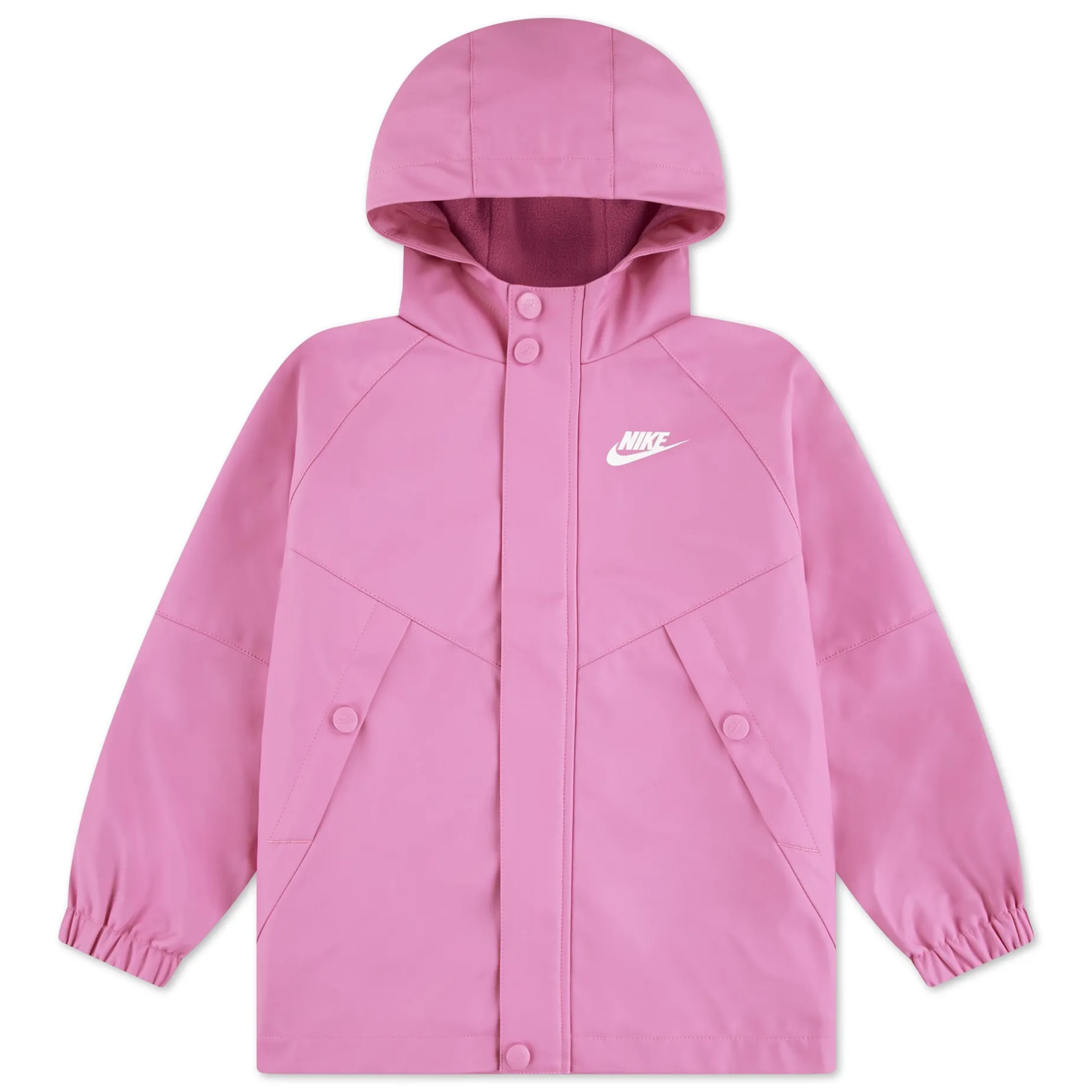 A little rain won’t stop little ones from going out to play so why not send them in something that will keep them warm, cozy and most importantly, dry while they’re out? This Nike jacket, made of smooth poly fabric bonded with a breathable, water repellent membrane to help keep kids dry in light rains, has a full-zip closure with a snap placket overlay to help keep the cold and rain out and keep warmth in. Elasticized cuffs help secure the fit, the upper body and hood are lined with soft fleece for extra warmth and snap-closure pockets help secure small items, making this jacket a fall essential.