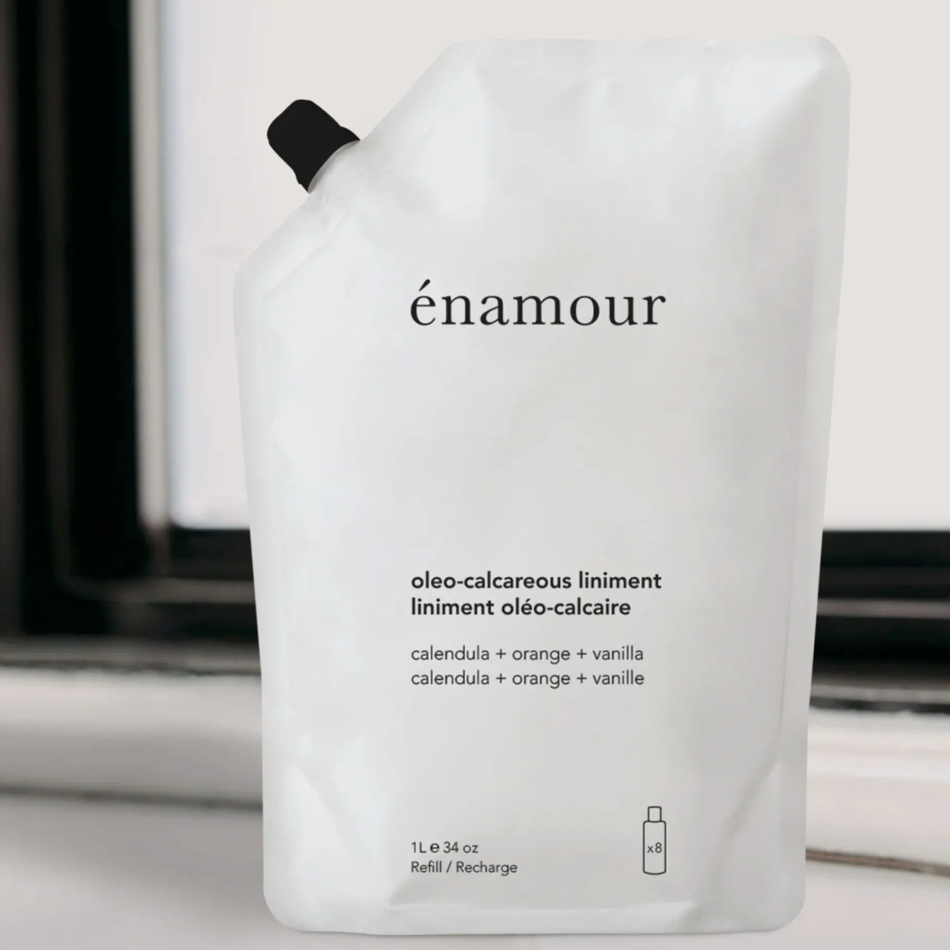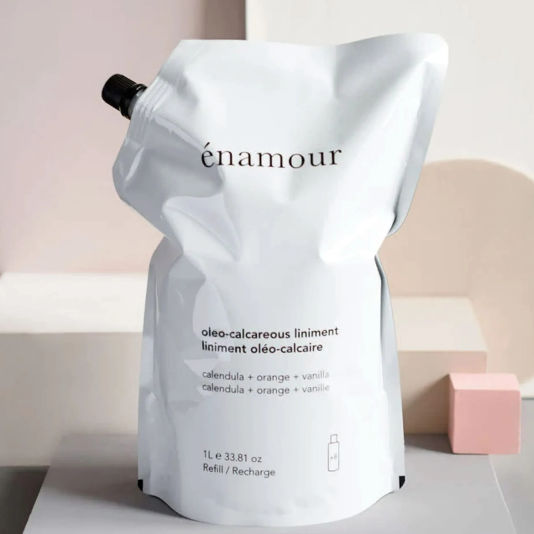 Enamour liniment is a deliciously fragrant substitute for generic baby lotions. Its key ingredient is alkaline lime water, which serves to neutralize the acidic pH of urine. The liniment leaves a light greasy film that protects baby’s skin from the harmful effects of urine. It also works wonders against cradle cap (also called “the hat”) on babies’ heads. A few applications are enough!