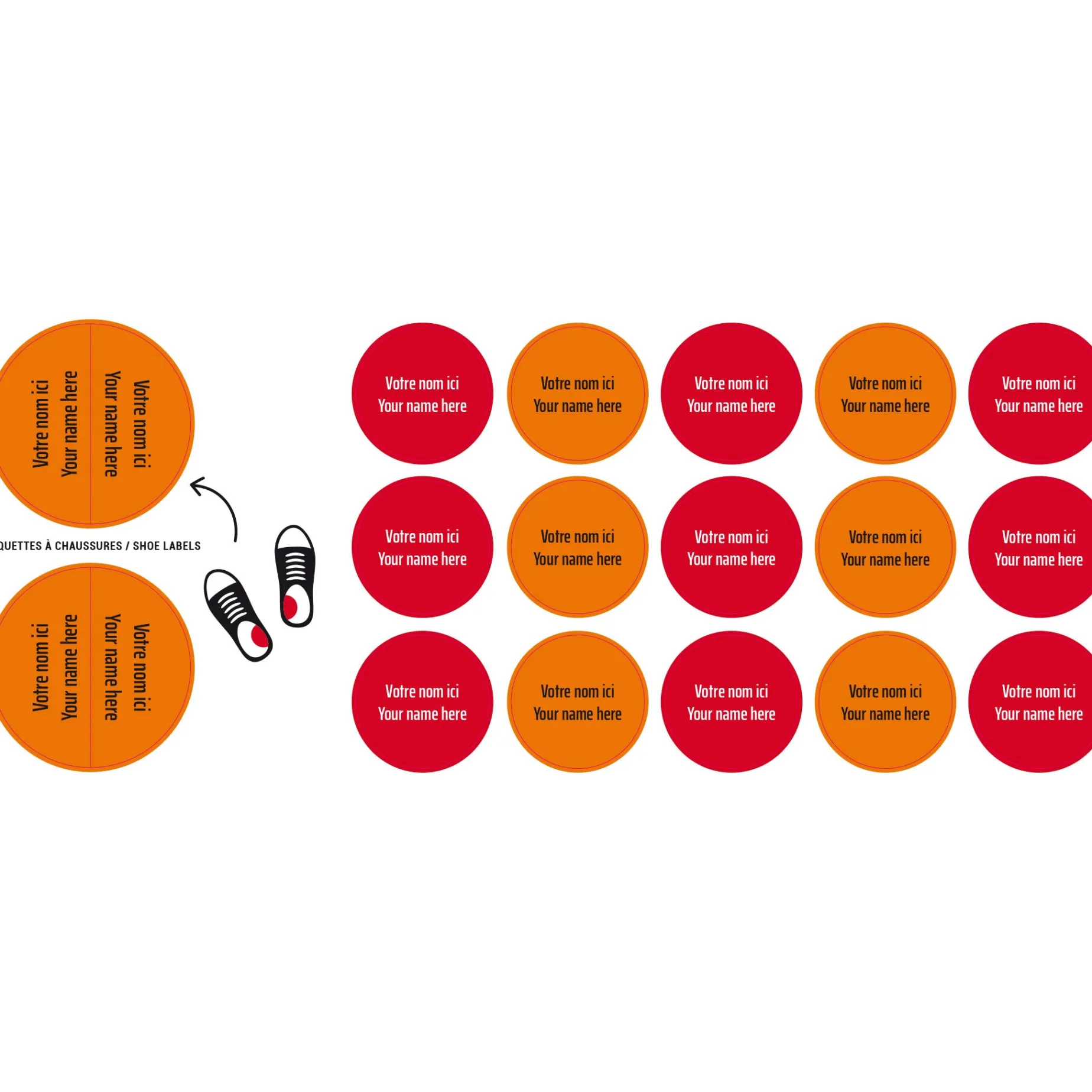 The Mini Edition is ideal for effectively identifying everyday items such as containers, clothing, shoes, and school supplies. This format includes 75 self-adhesive labels in various sizes, including 4 pairs designed specifically for shoes to help children identify the correct foot. Resistant to water, cold, heat, and steam, they are dishwasher, washing machine, dryer, microwave, refrigerator, and freezer safe. No labels require ironing: simply apply them to a clean, dry surface and wait 24 hours before exposing them to moisture or heat. The name and/or phone number is printed on two lines of 16 characters.
