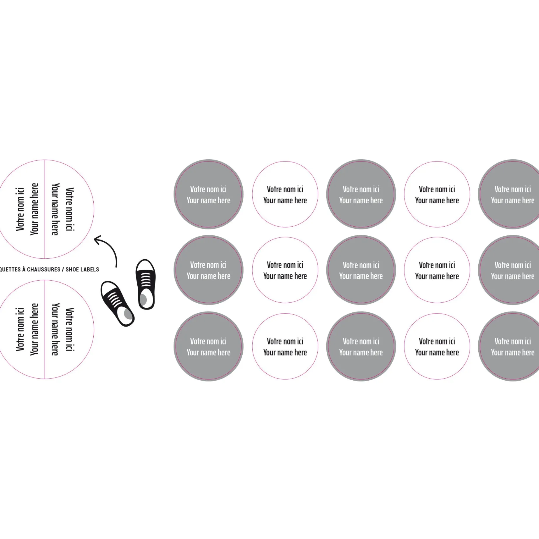 The Mini Edition is ideal for effectively identifying everyday items such as containers, clothing, shoes, and school supplies. This format includes 75 self-adhesive labels in various sizes, including 4 pairs designed specifically for shoes to help children identify the correct foot. Resistant to water, cold, heat, and steam, they are dishwasher, washing machine, dryer, microwave, refrigerator, and freezer safe. No labels require ironing: simply apply them to a clean, dry surface and wait 24 hours before exposing them to moisture or heat. The name and/or phone number is printed on two lines of 16 characters.