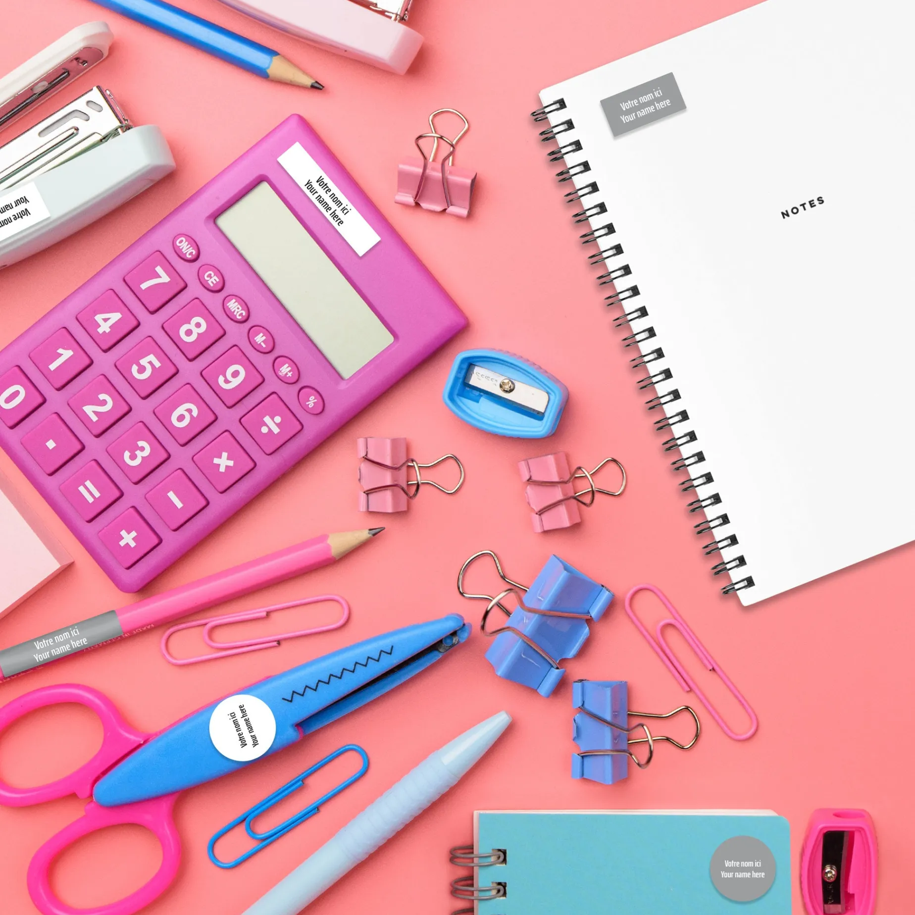 The set of personalized sticky labels ClĂ©ment becomes your best ally for the quick identification of your family’s personal items. In a few seconds, young and old will be able to recognize their school items, lunchbox items, sports equipment, shoes, clothes, etc. Waterproof and durable, the labels are not afraid of freezing, water, heat, or steam. They are resistant to the microwave, refrigerator, freezer, dishwasher, washing machine, and dryer.