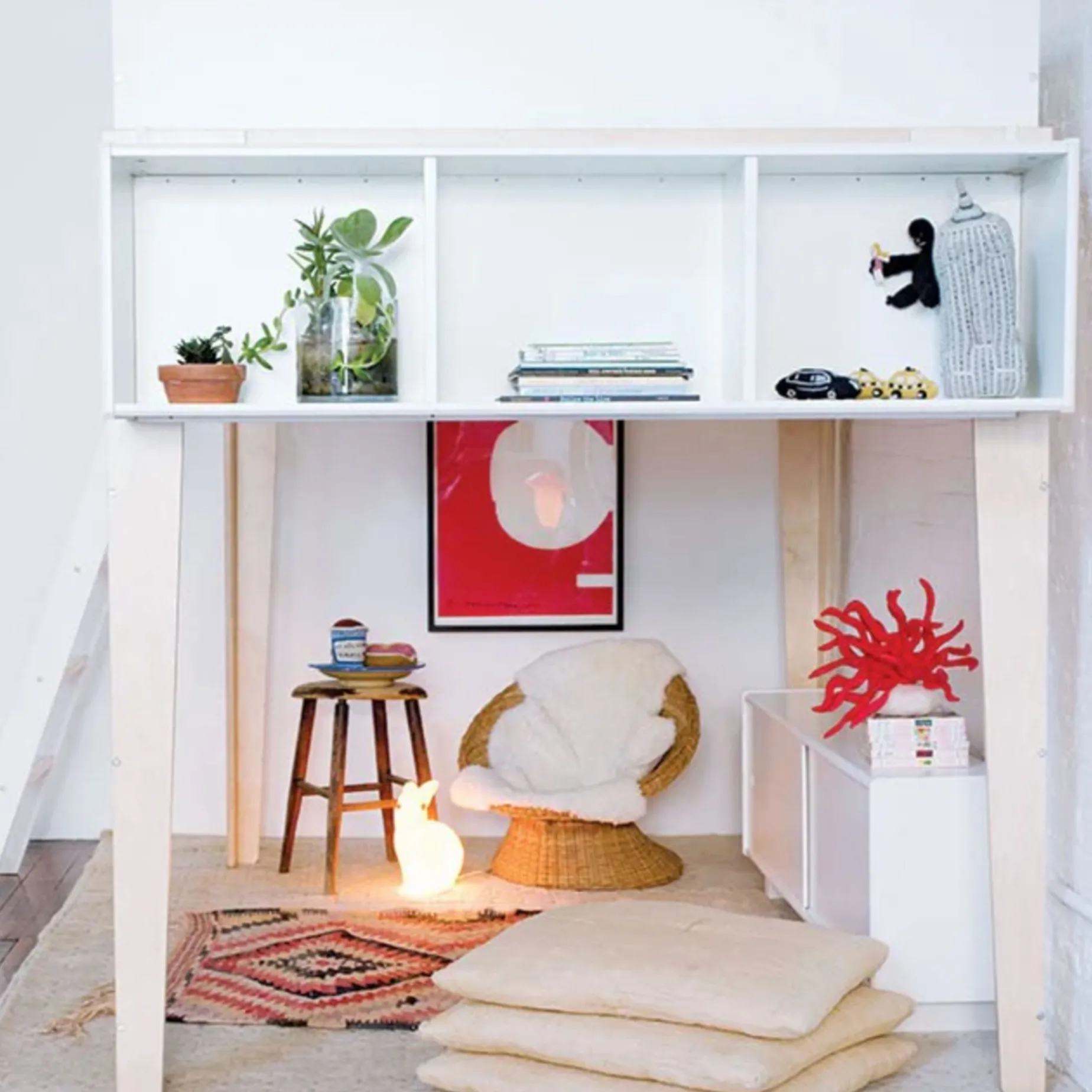 Compact footprint makes loft bed great for small spaces Brooklyn Desk, Mini Library, Toy Store fit perfectly underneath the Perch Loft Bed