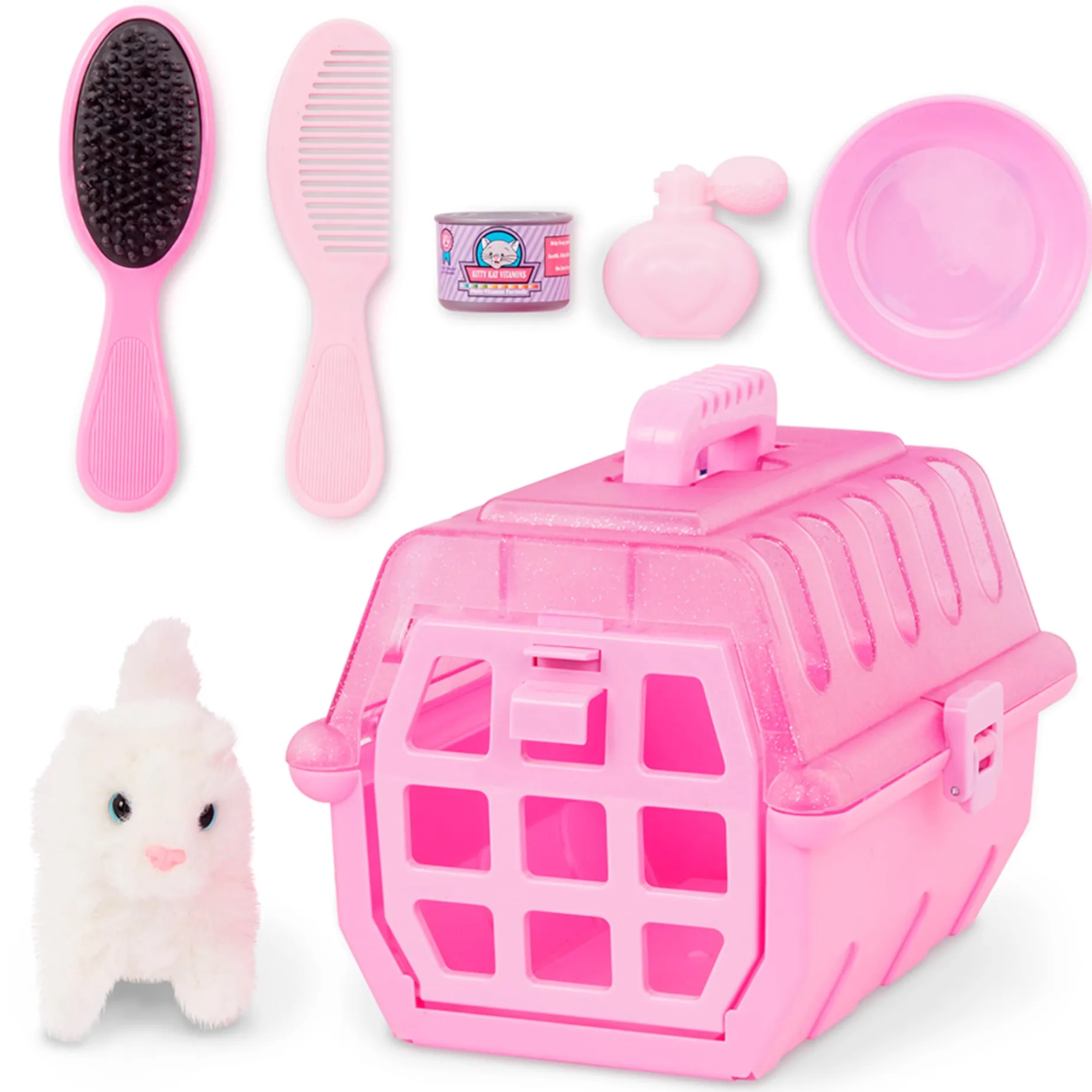 Keep your furry friends in fine form with this adorable pet grooming set for kids! The Play Circle Grooming Kit is a 7-piece set with everything you need to transport, feed, and groom your plush pet. A portable pet carrier keeps it safe and sound—pop open the door to say hello or snap open the lid to lift your pet out. Brush and comb the fur, finish with a spritz of pretend perfume, and make sure your friend is well-fed with the included bowl and food.