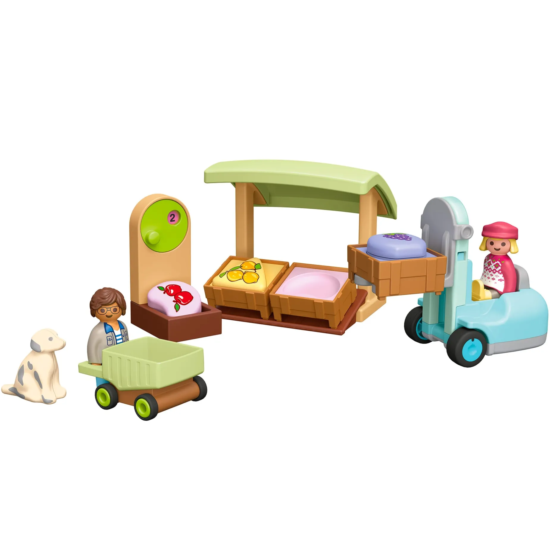 It’s market day! Which vendor has the crispiest vegetables and the sweetest fruits? With this colorful set, your child can gain their first shopping experiences. Who delivers the groceries and how are they weighed? With the Organic Market Stall, your child can playfully recreate the shopping process and, in the process, develop a sense for shapes, colors, and quantities. Does your child enjoy shopping? Then this set is perfect for you. At the Organic Market Stand, there’s plenty for little market visitors to explore. The forklift delivers fruits and vegetables. Quickly, the crates are unloaded, and the sales begin. How many bananas are printed on the shape block? Who can turn the scale to the correct number? And how many fruits fit in the shopping cart? Who can sort all the fruits and vegetables into the right crate? After the successful shopping trip, there’s still one question left: Which fruit or vegetable tastes best?
