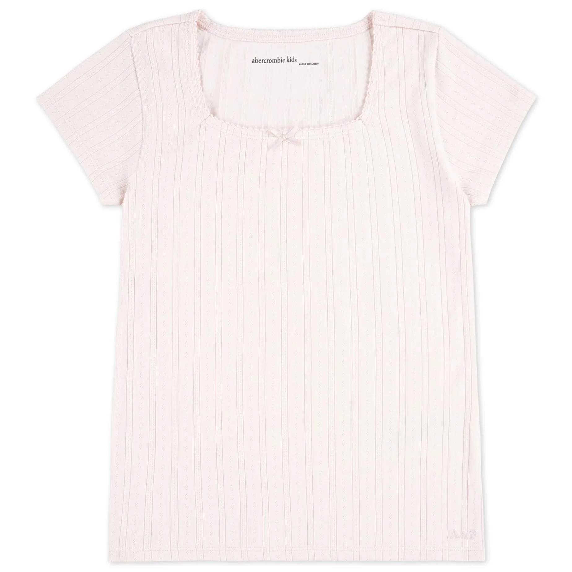 Upgrade your child’s wardrobe with A&F’s Pointelle Square Neck Tee. This trendy top features a chic square neckline and short sleeves, perfect for any occasion. Made from soft, stretchy Pointelle fabric, it offers both style and comfort for your fashion-forward kid.