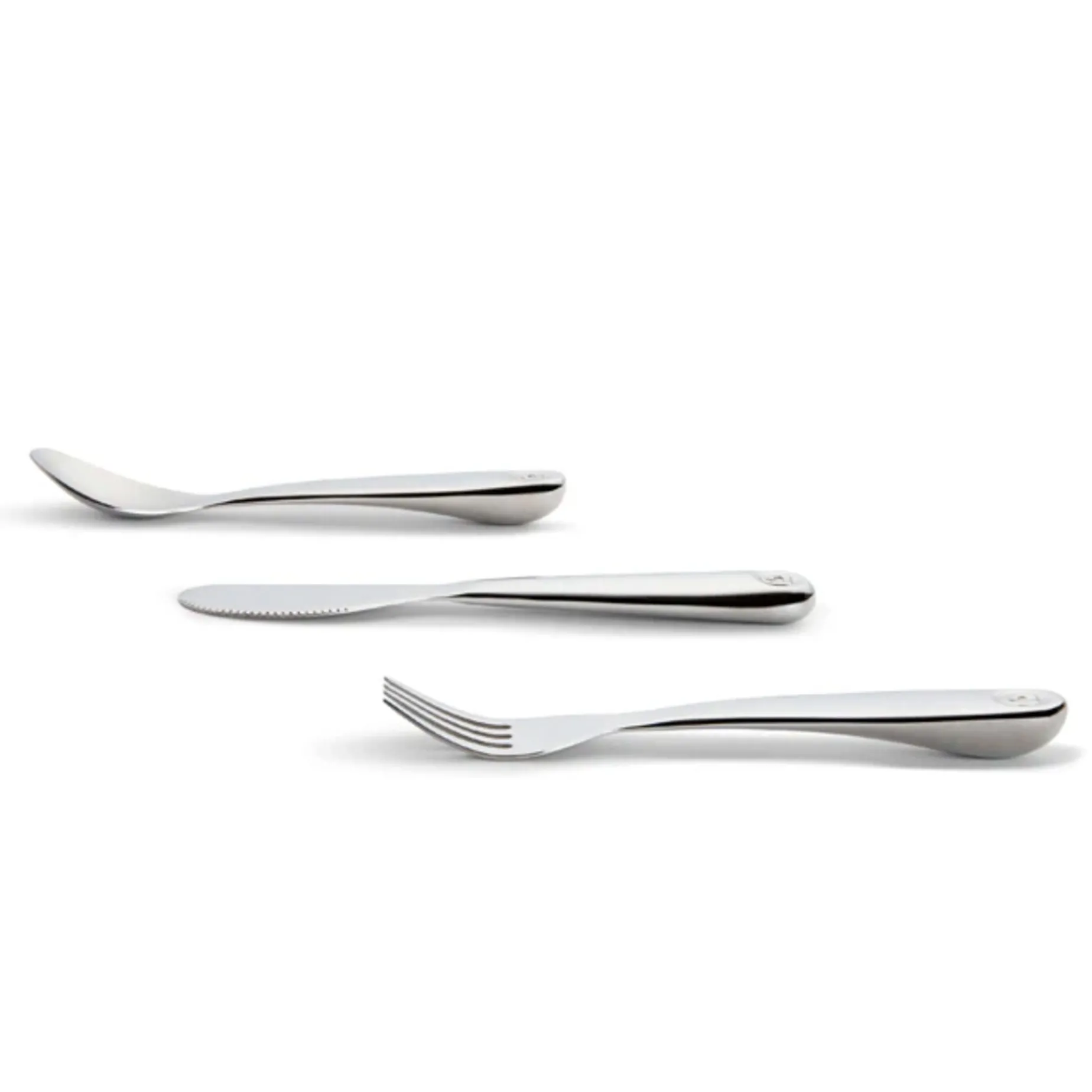 -Stainless steel flatware set helps transition toddlers to full-size utensils