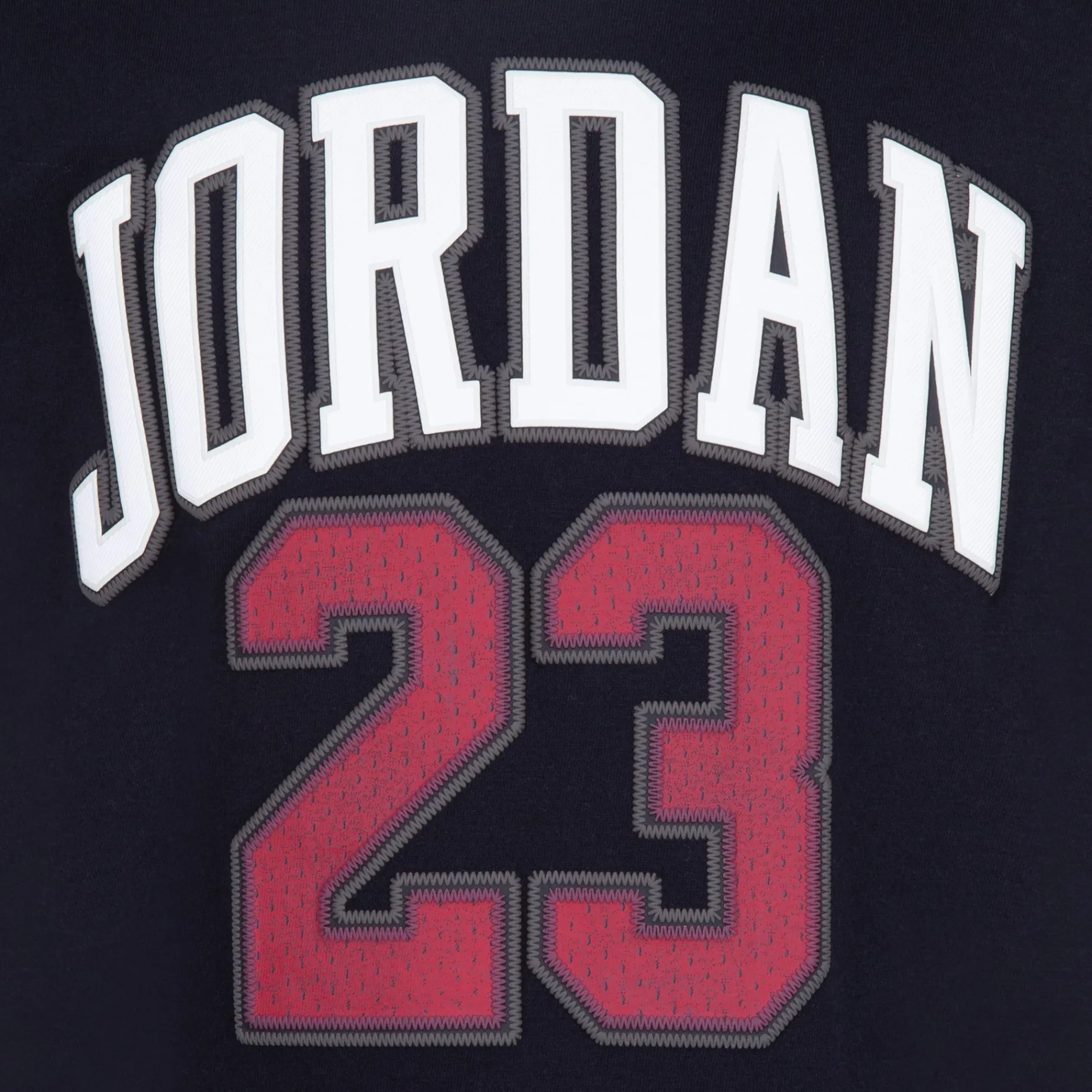 Whether you’re going to team practice, to class or to hang with friends this jersey inspired tee from Jordan will fit the bill. It’s made of soft cotton/poly jersey, the tagless crewneck provides comfy wear and the textured graphic print will complement your Jordans nicely.Â