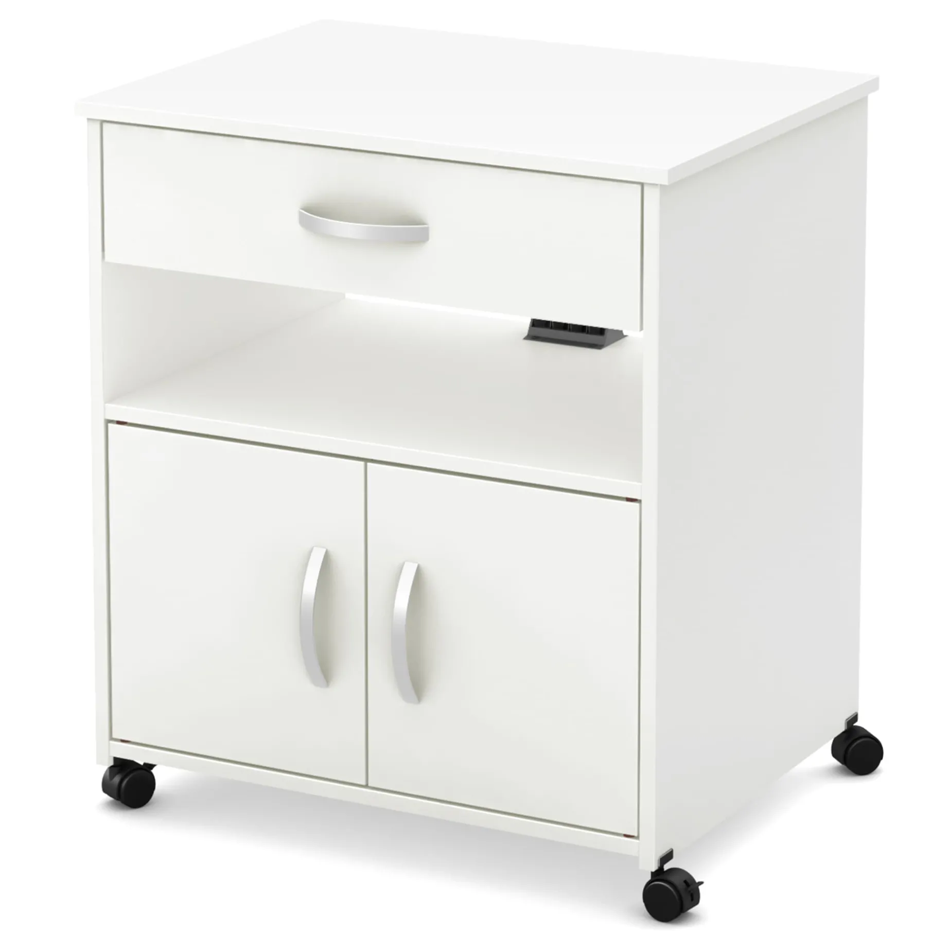 A versatile look The straight lines on this product give it a Contemporary look, so you can be sure it’ll go with the furniture you already have. The drawer and cabinet doors feature rounded plastic handles. The Axess printer stand with storage is ideal for creating a neat and tidy workspace, where everything is put away!