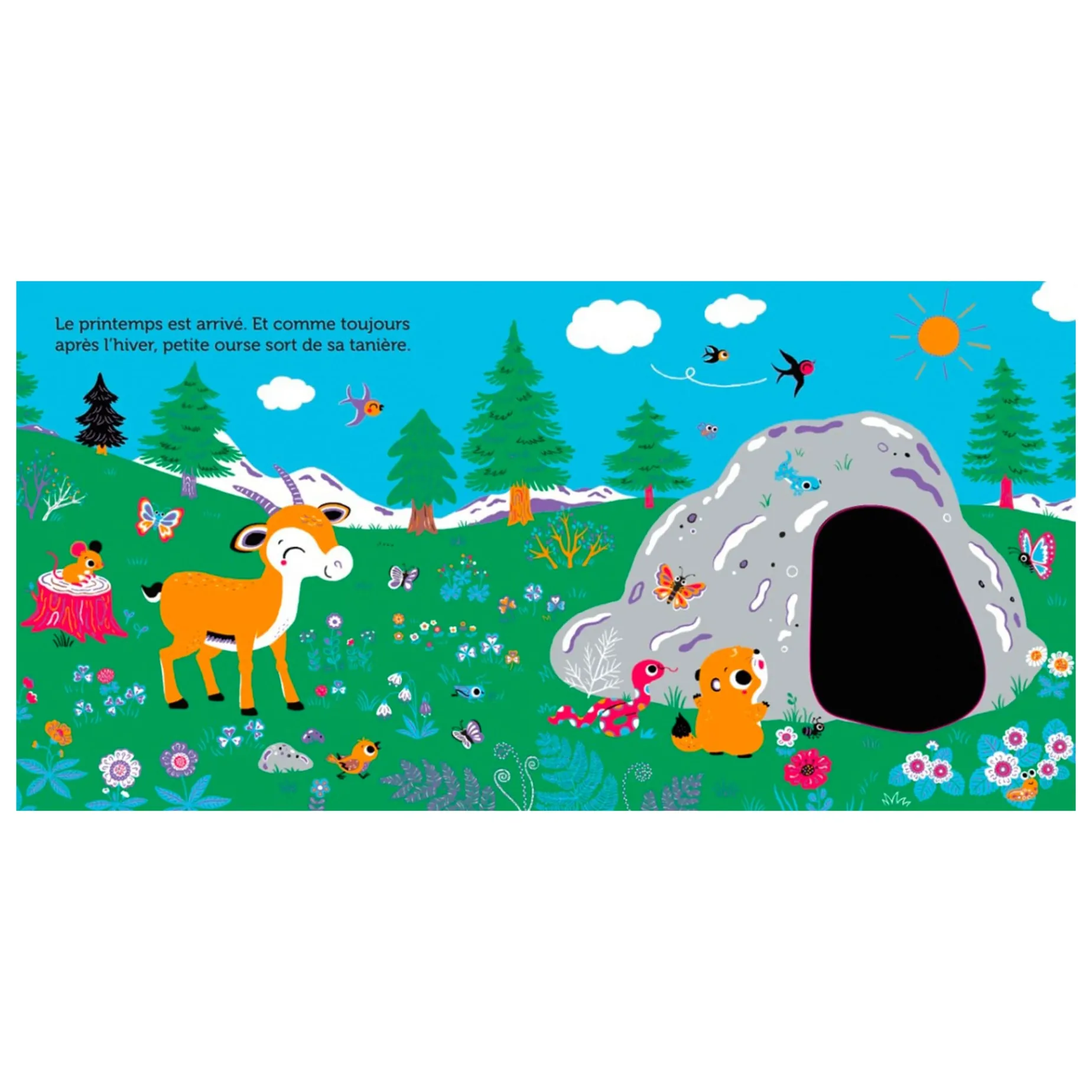 Suivez les aventures de petite ourse dans la nature ! Un livre animé aux illustrations poétiques et aux reflets argentés qui captive les tout-petits dès leurs premiers mois. Petit ourse s’éveille au printemps : de la tanière à la rivière, en passant par la prairie fleurie, les tout-petits découvrent un univers enchanteur rehaussé de délicats effets argentés.