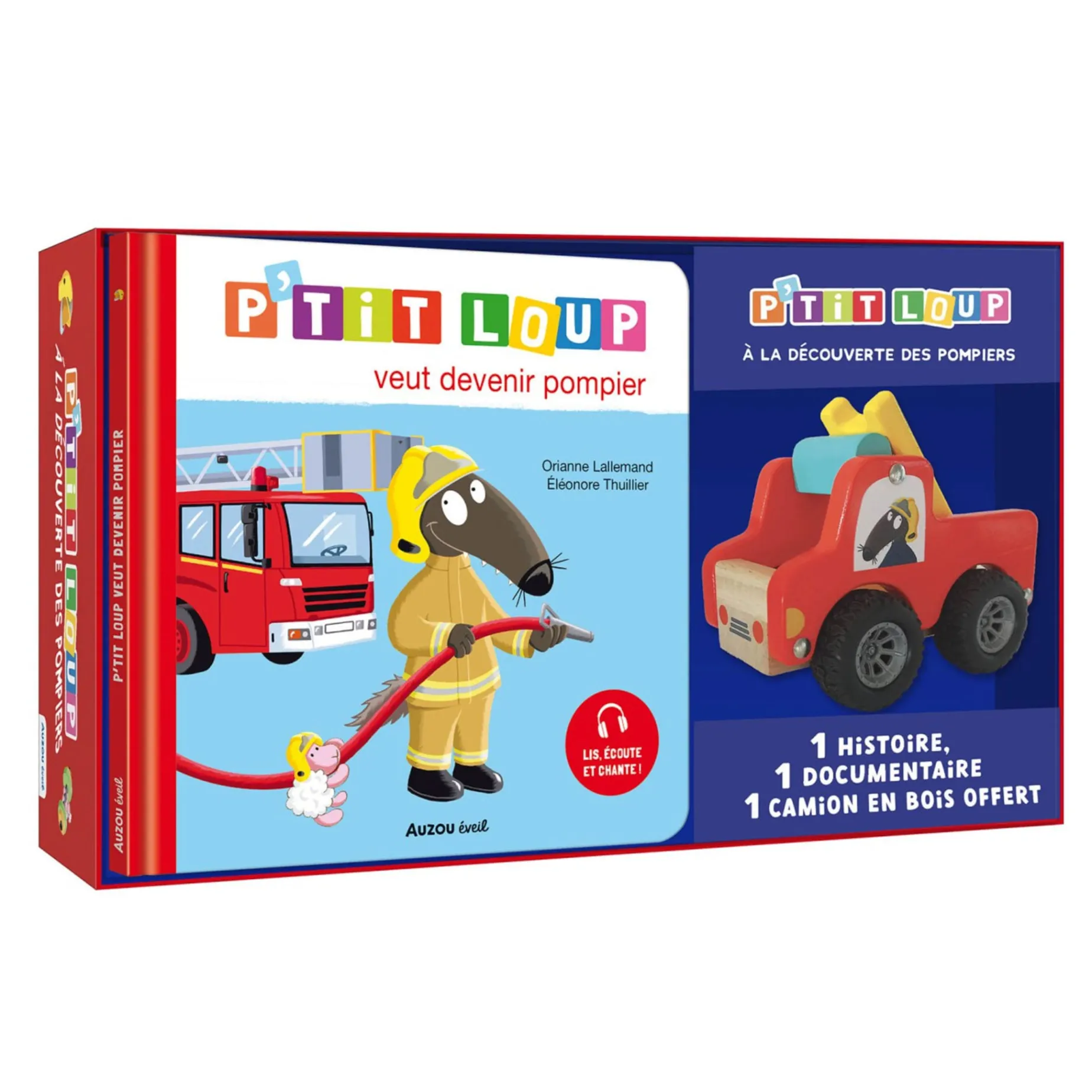 Un nouveau coffret P’tit Loup complet pour découvrir les pompiers !Grace à l’album et au documentaire l’enfant va pouroir se plonger dans l’univers d’une caserne de pompier, et recréer les scènes avec son super camion en bois! Le temps de la lecture, l’enfant va se retrouver plongé dans cet univers et vivre d’incroyables aventures !