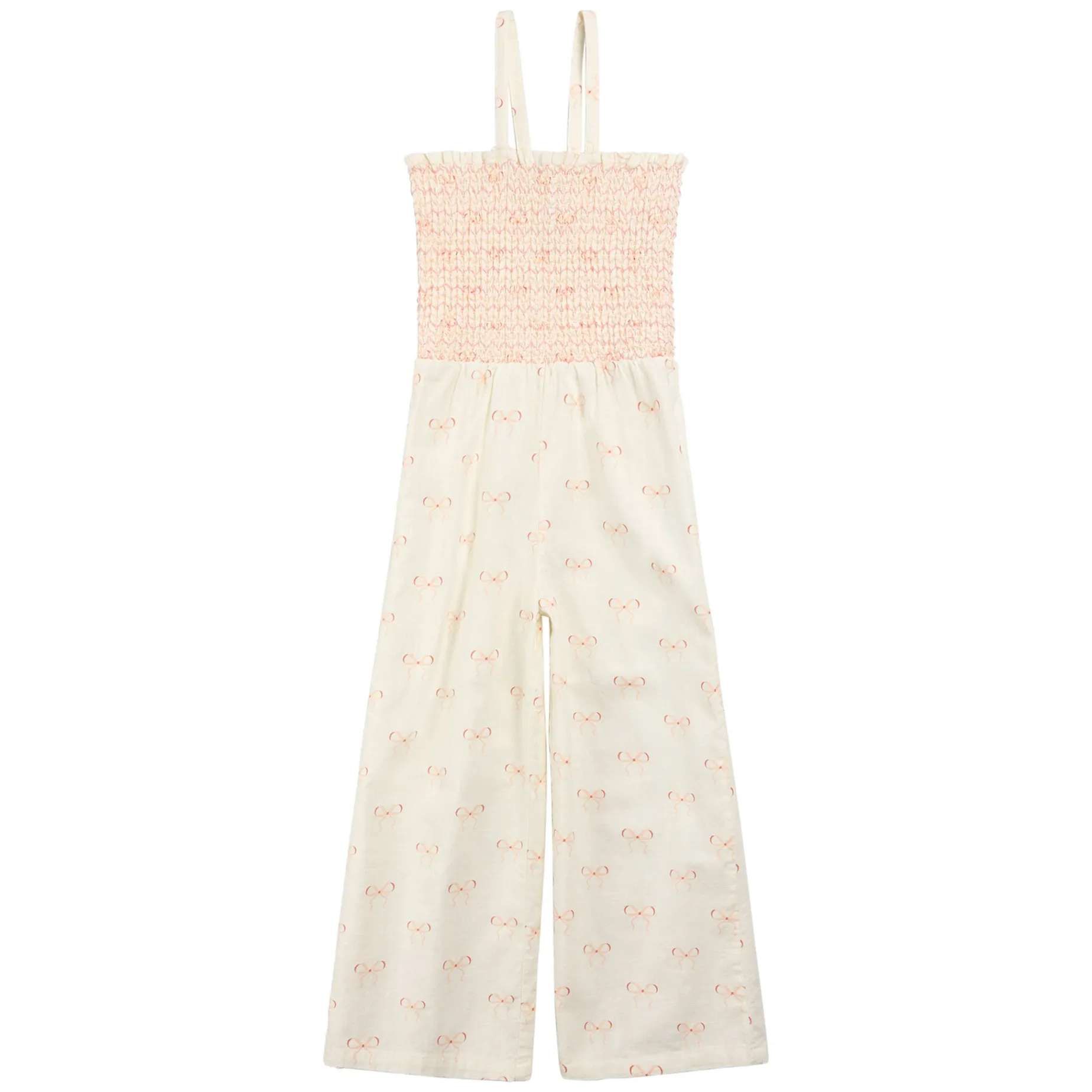 Featuring our all-over Bows print for a totally on trend style, this wide-leg romper is perfect for mini trendsetters. The strappy top has a ruched finish, providing a snug and flattering fit while the wide legs offer a light and breezy feel for warmer days. Made with organically grown cotton slub, the romper has a soft-to-touch finish that keeps her comfortable all day.Â