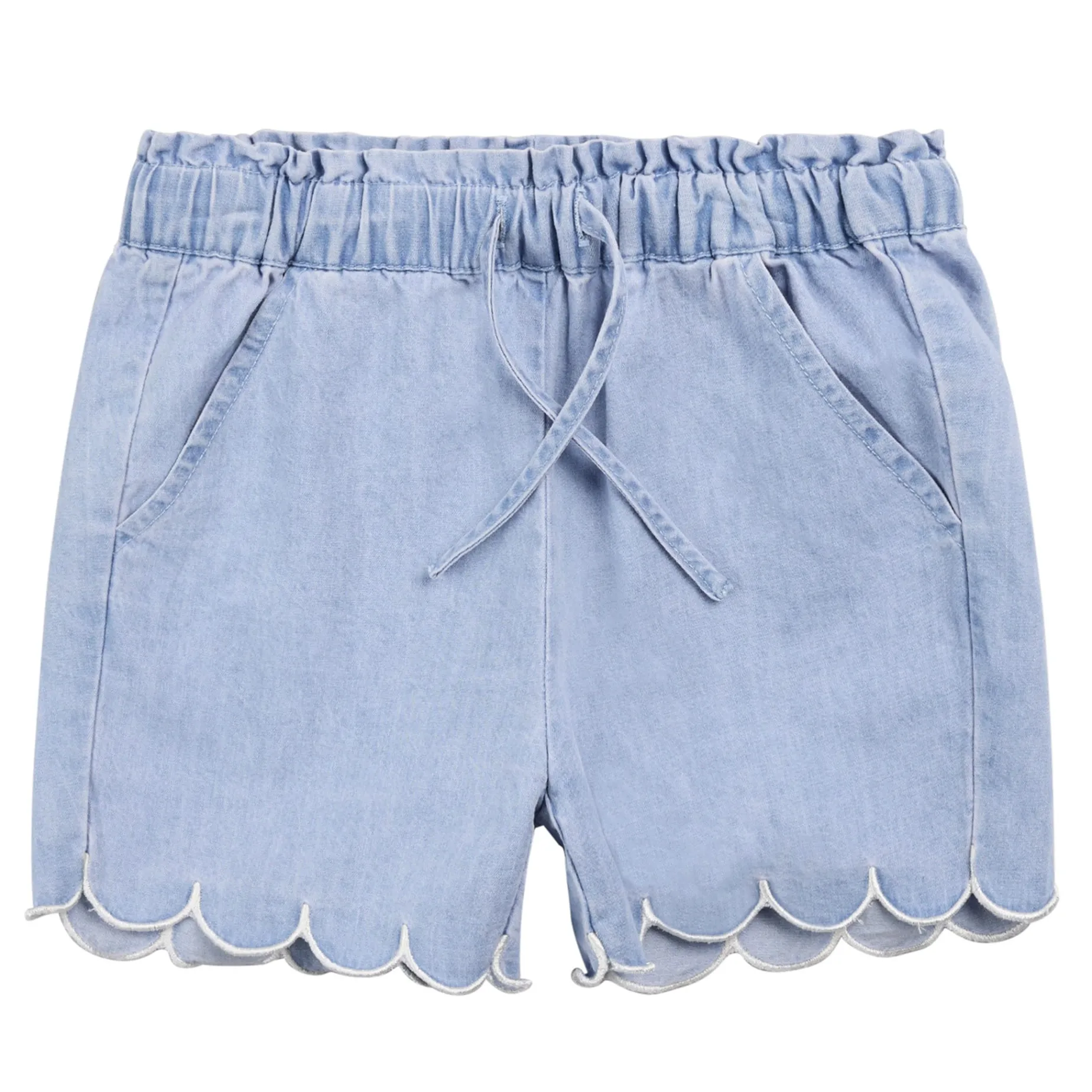 A light and airy take on a staple. These denim shorts are made from an easy breezy, organically grown cotton chambray for a soft touch and breathable fit. With an elasticated, paperbag waistband, the shorts offer a comfortable fit that lasts all day while the scalloped edge adds something a little special to her outfit. Pair with the peplum top from the same range for an irresistibly chic double denim look.Â