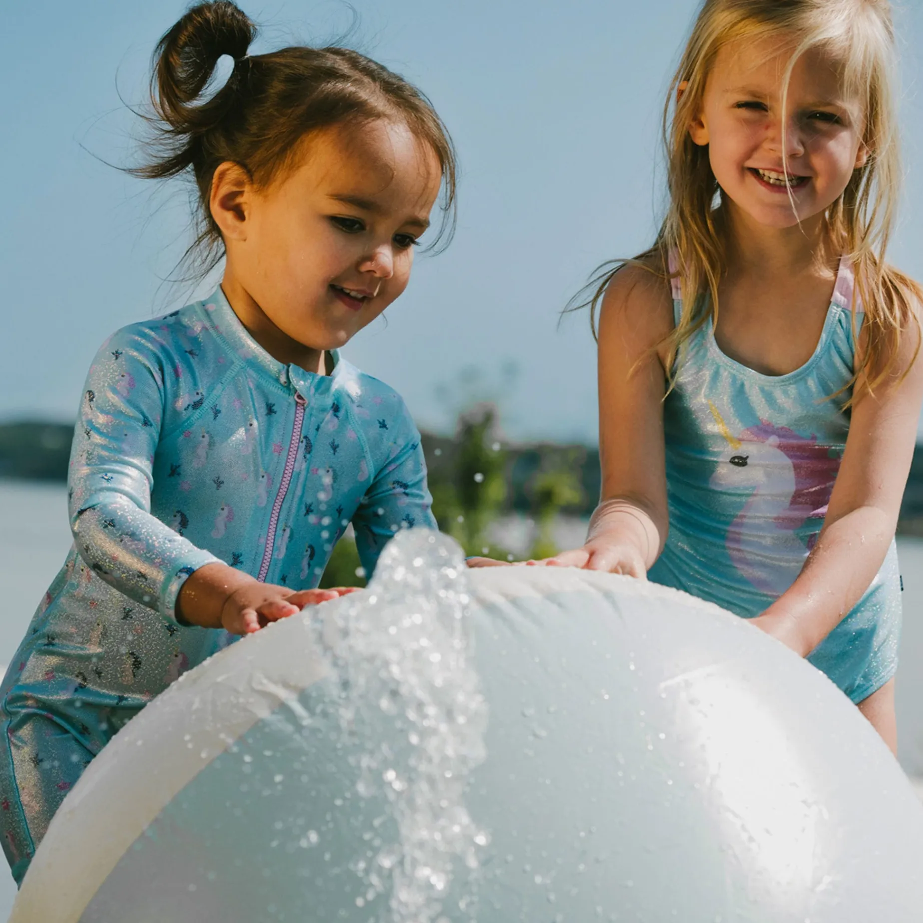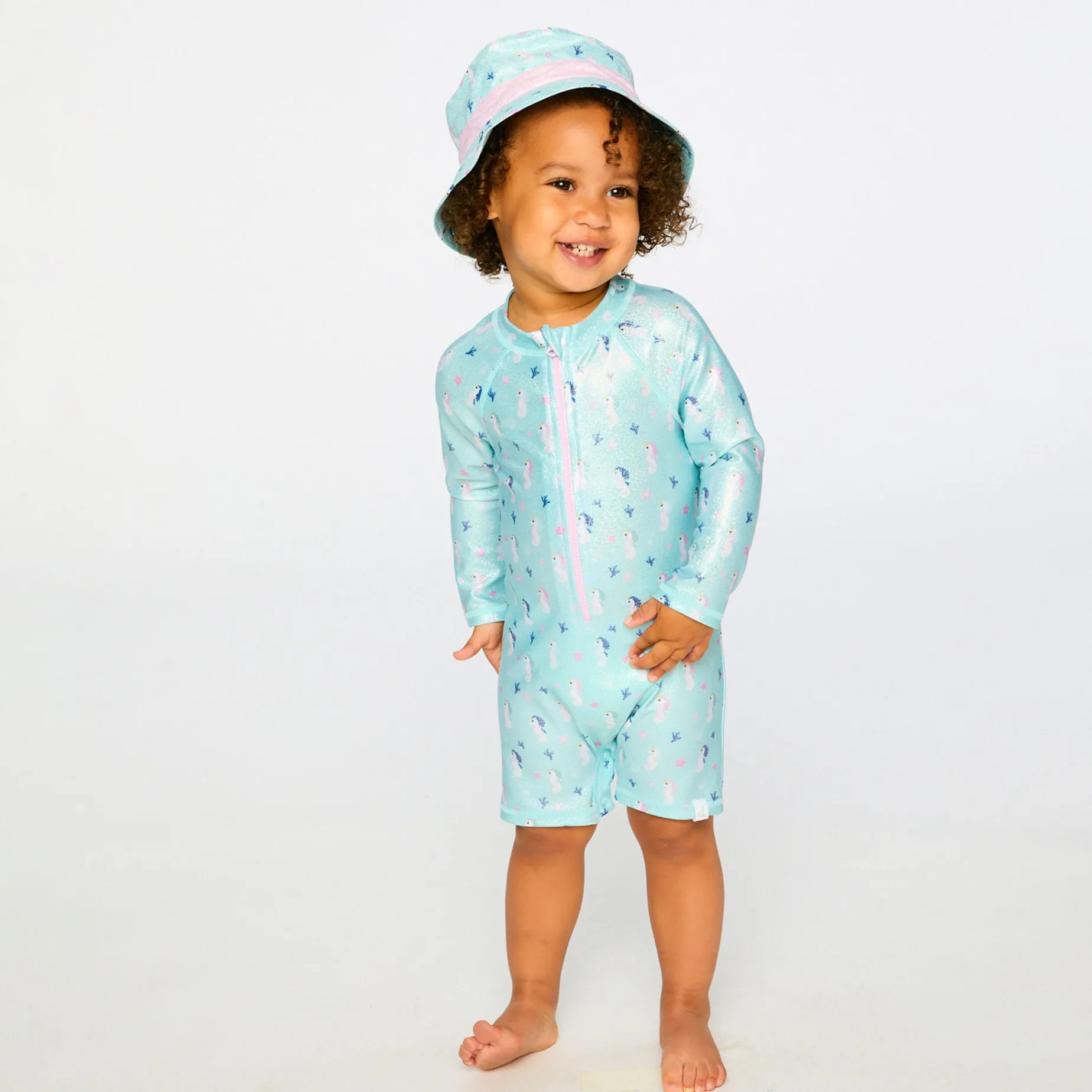 The baby and toddler one-piece long sleeve rashguard in blue with seahorse print is a playful essential for little girls at the beach or pool. This long-sleeve swimsuit features an allover seahorse print on a soft blue background, a mock neck, bottom-snap closure and a front zipper for easy dressing. Made from recycled polyester with added stretch, it offers sun protection, comfort, and style for splashing around all summer long.