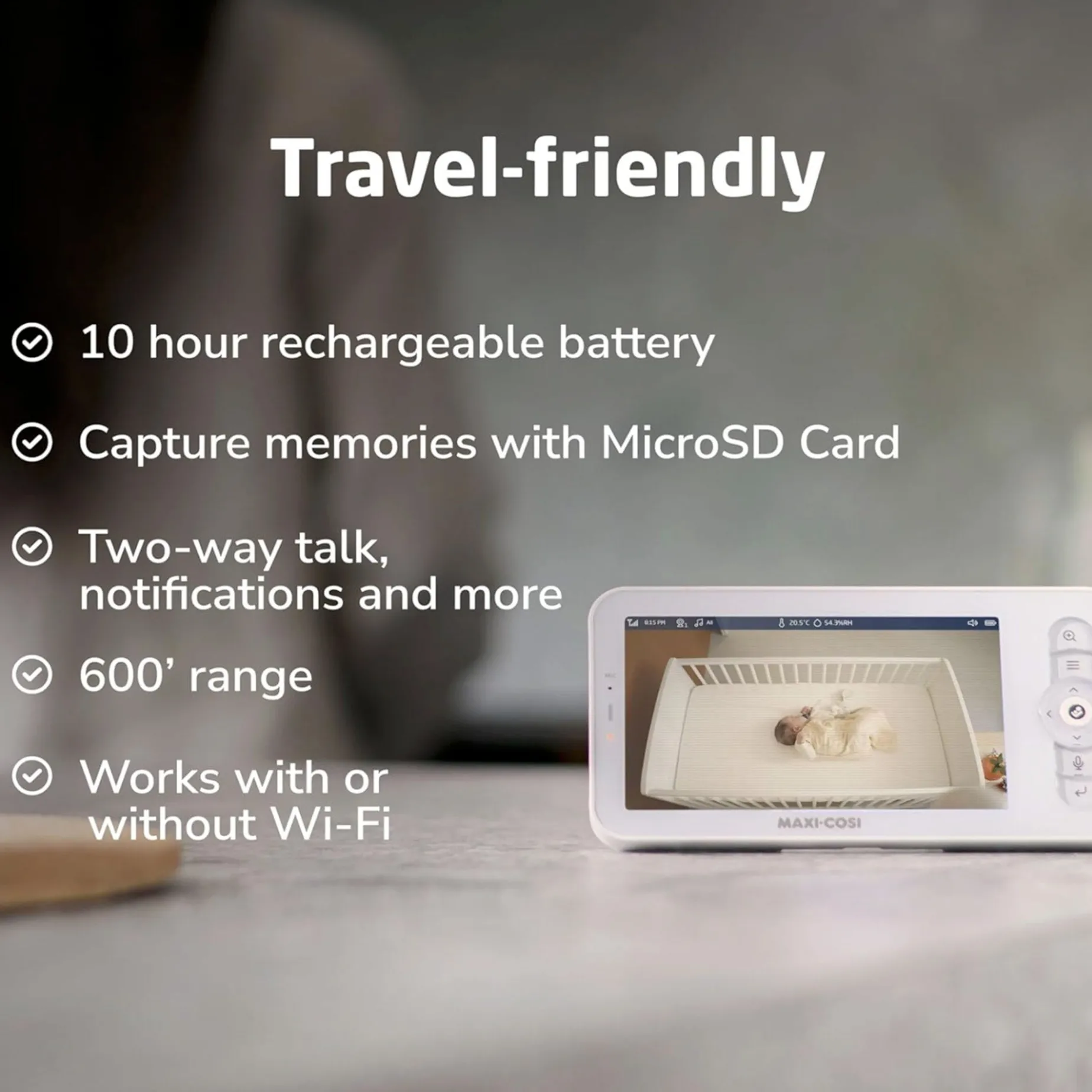 Includes a Parent Display with rechargeable battery, MicroSD for saving memories, two-way talk, and a 600’ range. The Parent Display doesn’t require a Wi-Fi connection.