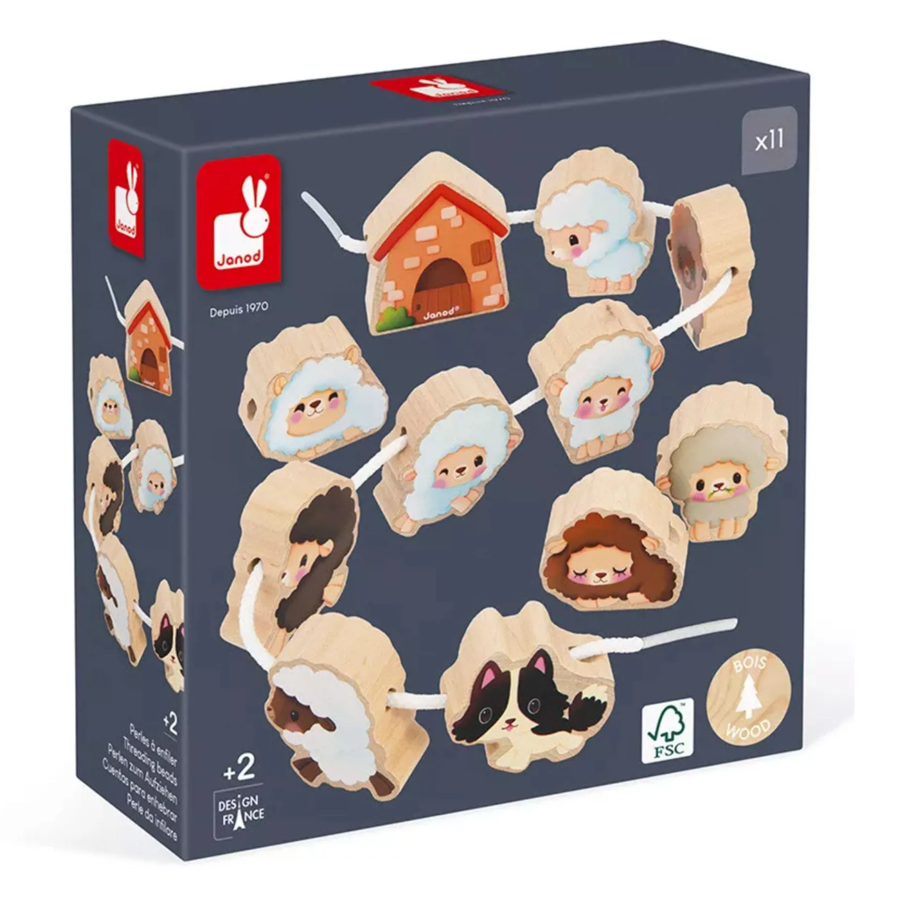 Quick, to the sheep pen! With this set of farm-themed wooden threading beads, babies aged 2 years and up will develop their fine motor skills through play. Our friend the sheepdog needs help guiding the sheep into the fold! This early-learning toy consists of 11 wooden pieces (9 sheep, 1 dog, 1 small hut) and 2 cords. The rigid tips at the end of each cord make it easier for chubby little hands to thread the beads. This early-years toy also promotes your child’s imagination because the pieces can be stood upright and used as figurines. Great stories