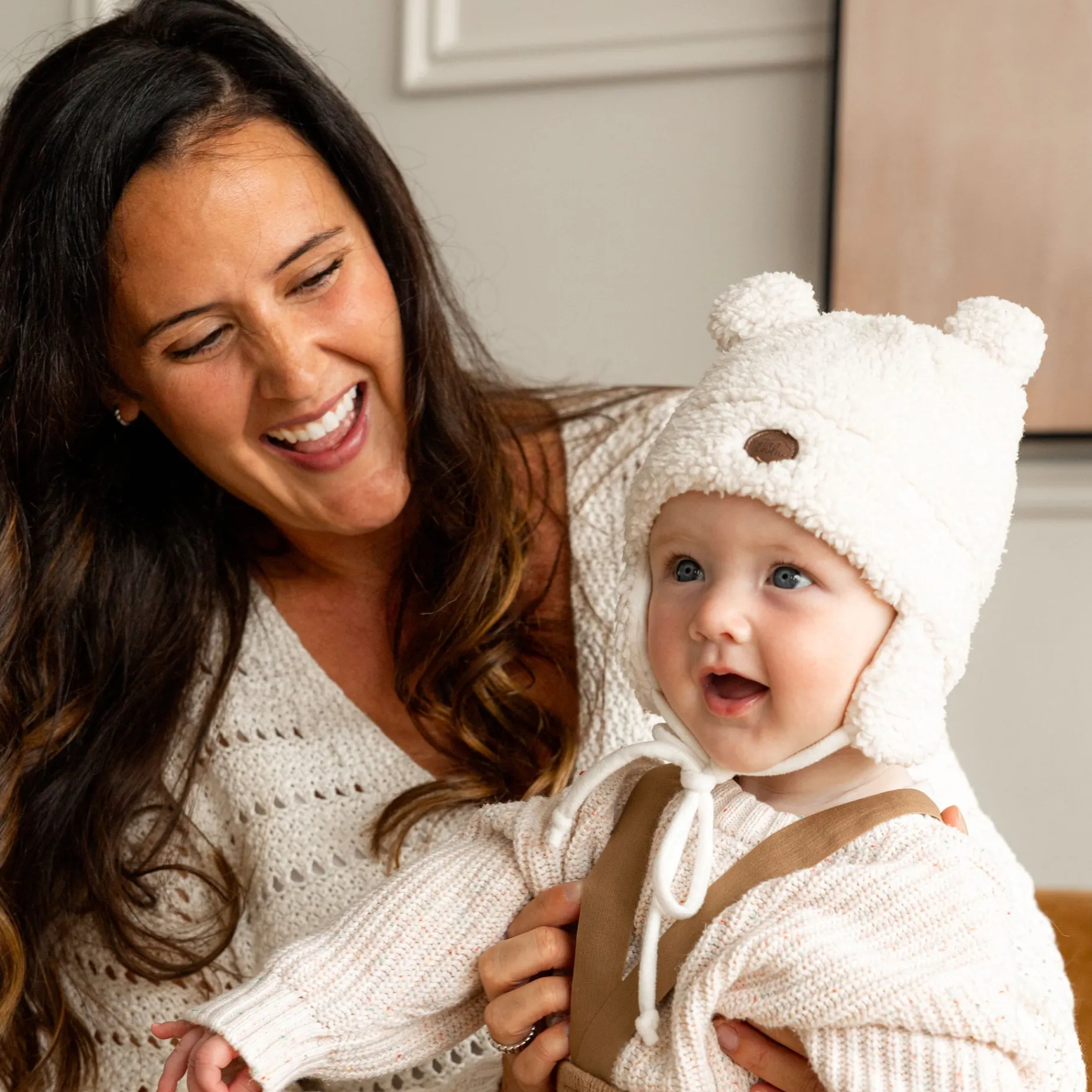 This beautiful set accompanies the baby through 3 seasons (spring, fall, and winter), making it an essential ally for mothers. Made of woven polyester and Sherpa (sheep texture), it includes a lovely pair of booties, a teddy bear hat adorned with cute little ears, a pair of mittens, and a soft, plush blanket to keep the baby comfortable and warm during outdoor outings. It is the perfect match to our new Sherpa car seat cover (available in 3 seasons and winter models)!
