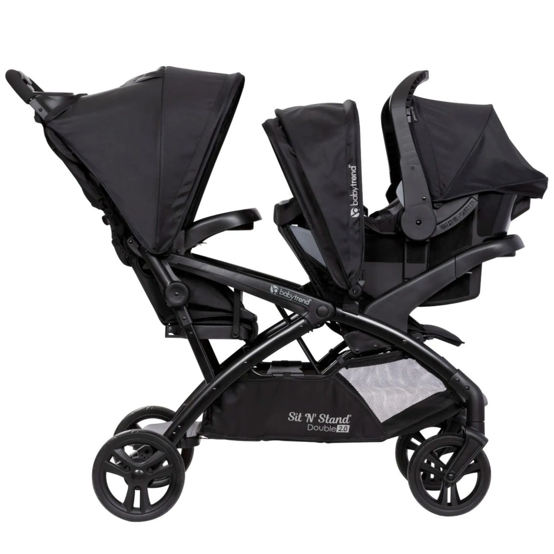 Streamlined, single front wheels allow for an easy push and a more compact footprint for the new Sit N’ Stand Double 2.0. Your two will stroll in quality, comfort and style with this redesigned favorite of growing families. The Sit ‘N Stand® combines maximum comfort and safety with sleek style and will make your trip to the park easy and enjoyable. Both seats have a 5-point safety harness for maximum security. The front seat has a removable 2 panel fully ratcheting canopy, and the rear seat has a fixed canopy with visors to block the sun. This Stroller also includes a hassle free one-hand fold, an extra-large basket for all your travel necessities and a parent console with cell phone holder and 2 cup holders.