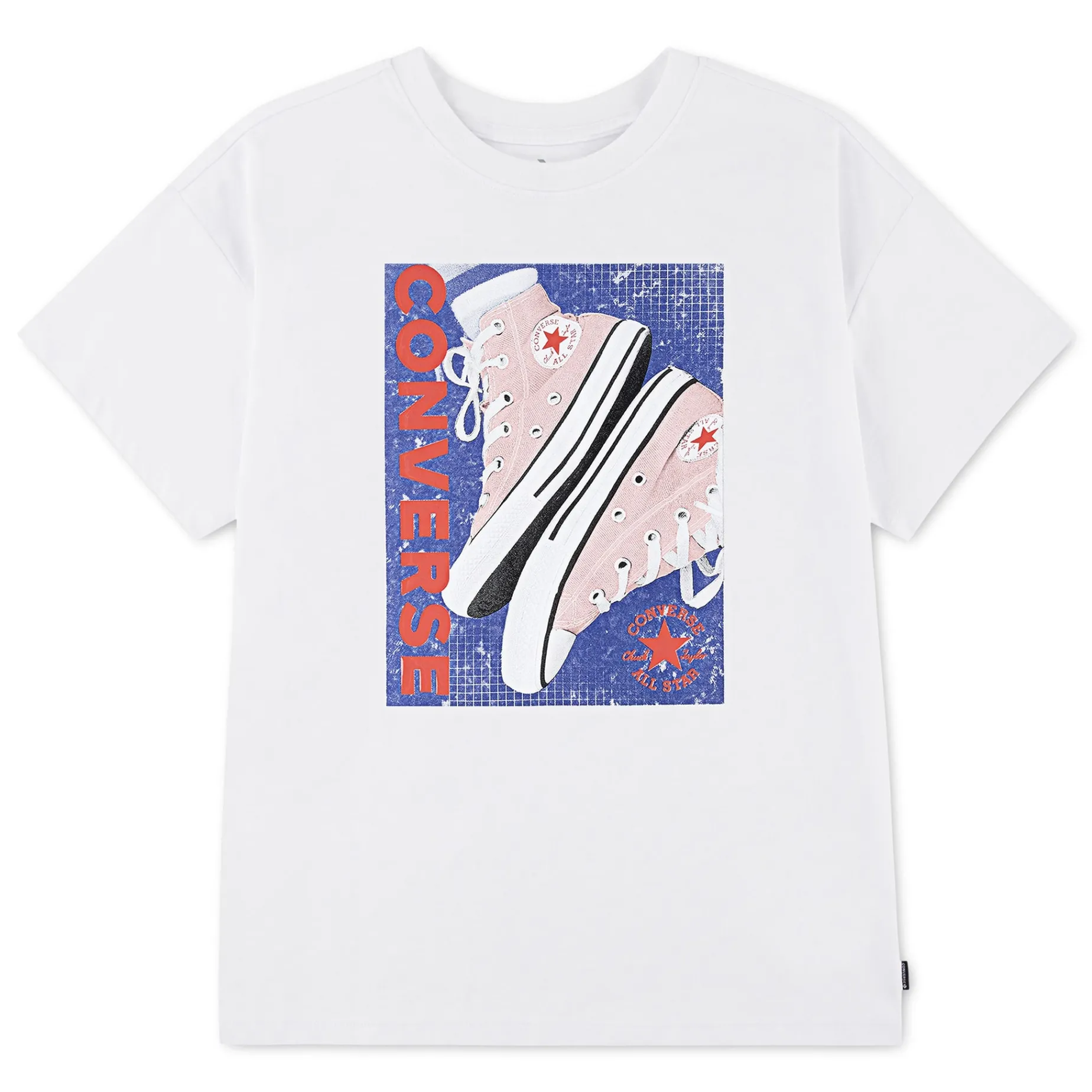 This cozy tee is an oversized silhouette for a borrowed-from-big-sibling fit. It features a large graphic of Chuck Taylor sneakers with the wordmark logo, the tagless crewneck provides a fuss-free feel, and the dropped shoulders relax the fit.