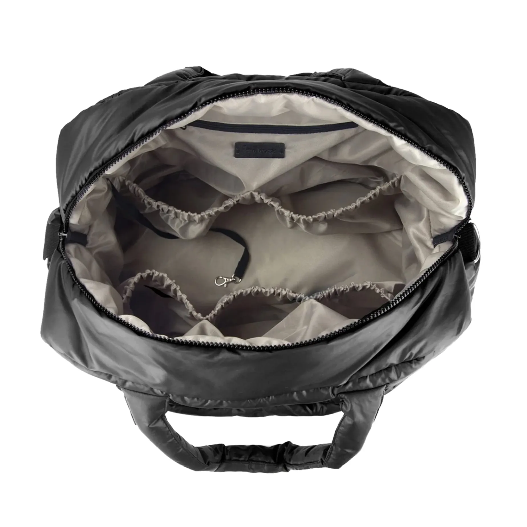 – Roomy interior with 5 elasticized pockets, zippered wallet pocket, key leash, and padded laptop sleeve