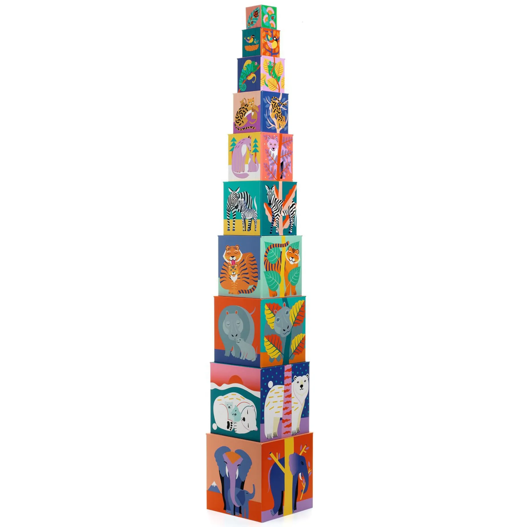 Nesting blocks with colourful graphic art illustrations. 10 thick-card blocks to fit together, stack and knock down as much as you like! Stack the blocks so that the illustrations form a logical sequence.
