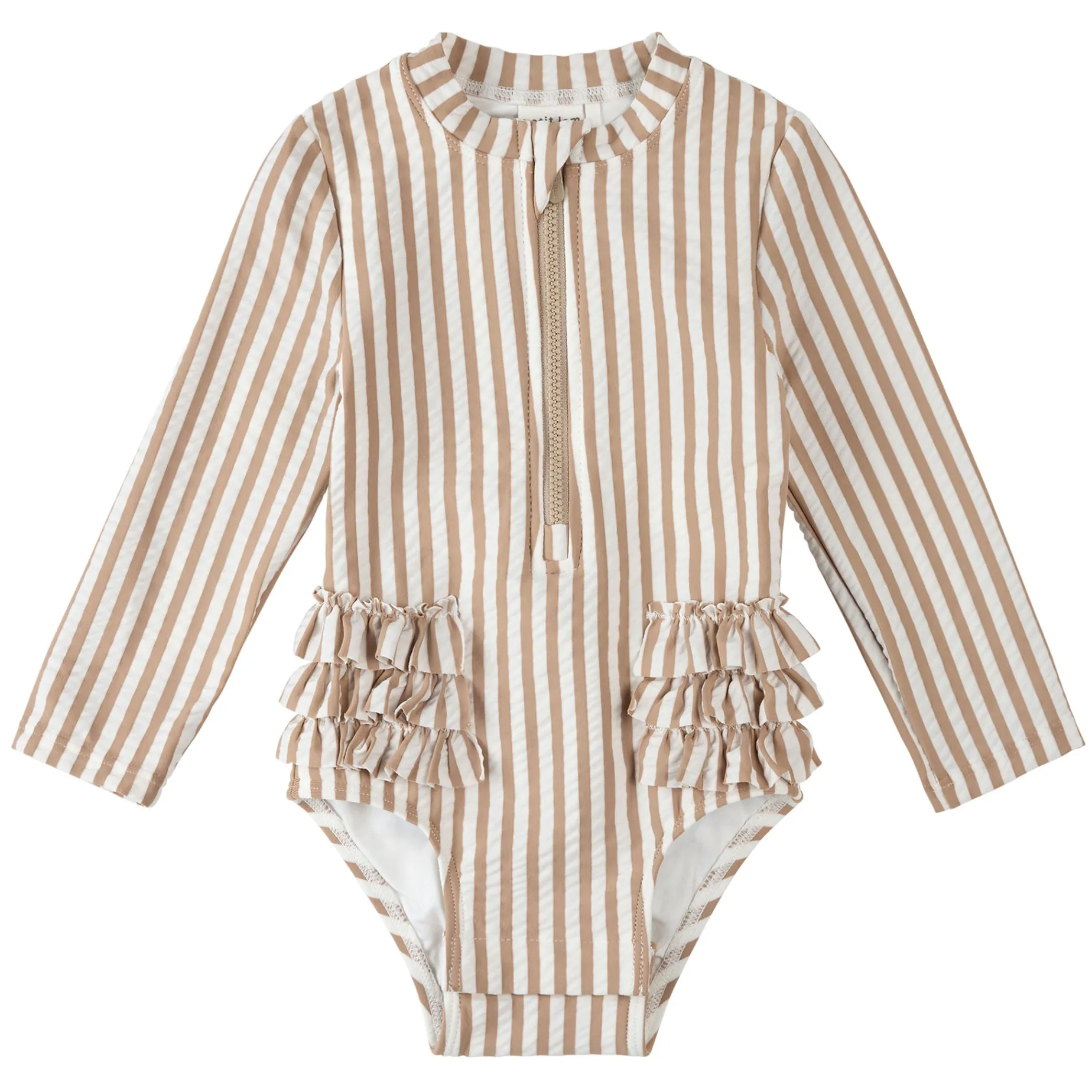 Made for family days by the sea, this taupe stripe, seersucker bodysuit coordinates effortlessly with swimwear available for the whole family. Keeping her comfortable through every giggle and splash, the swimsuit provides full coverage with its long-sleeved design and built-in UPF50+. The front zipper makes dressing quick and fuss-free, so spontaneous dips and sandy adventures are always an option.