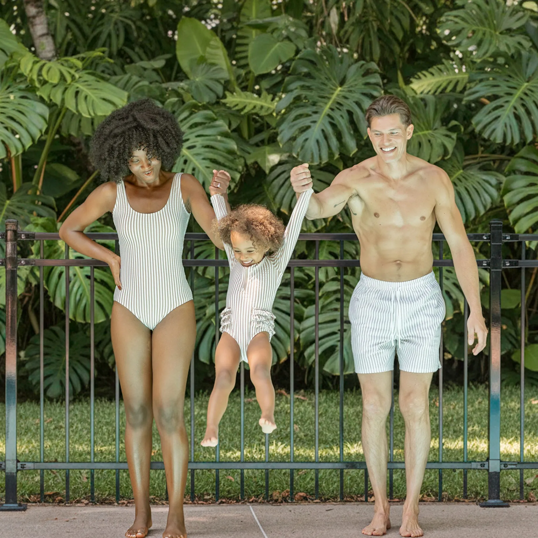 Made for family days by the sea, this taupe stripe, seersucker bodysuit coordinates effortlessly with swimwear available for the whole family. Keeping her comfortable through every giggle and splash, the swimsuit provides full coverage with its long-sleeved design and built-in UPF50+. The front zipper makes dressing quick and fuss-free, so spontaneous dips and sandy adventures are always an option.