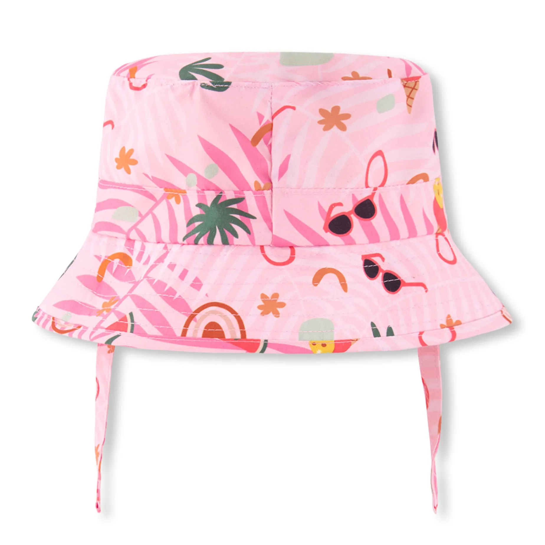 Bring a bloom of charm to sunny days with this beach hat in purple with flower print. Designed with wide brim protection and a pretty allover floral motif, this hat adds both style and shade to outdoor fun. The practical chin straps keep it securely in place, while the recycled polyester fabric with soft lining ensures comfort all day long. Pair it with any outfit from our “Like A Fish To Water” collection. Please note that there are no drawstrings in children’s size 2/3 & 4/5.