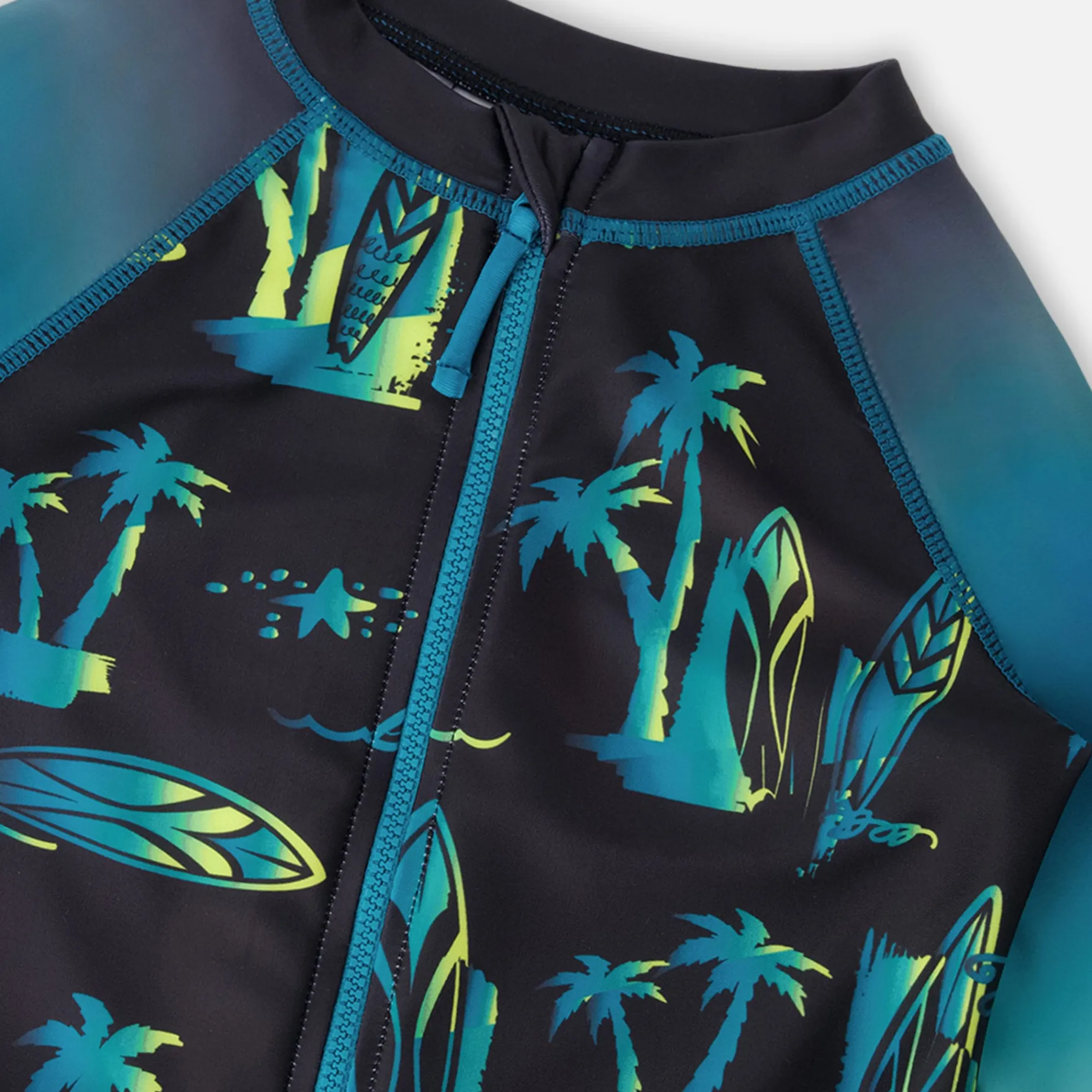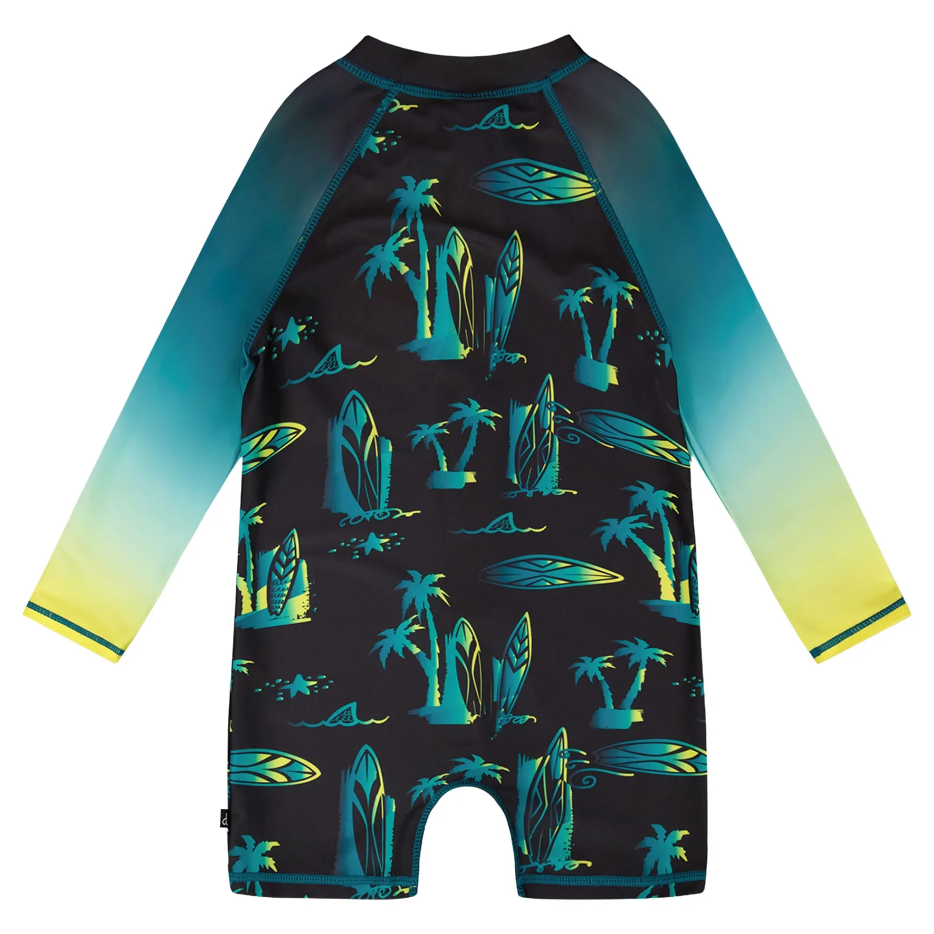 The baby and toddler one-piece long sleeve rashguard in black with surf print is designed for style and sun safety. This one-piece swimsuit features long sleeves and an allover surf-inspired print with boards and palm trees on a black background, crafted from recycled polyester with added stretch for comfort. A front zipper makes dressing simple while ensuring extra coverage for boys during long summer days by the water.